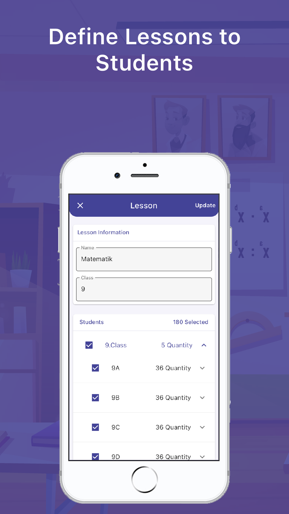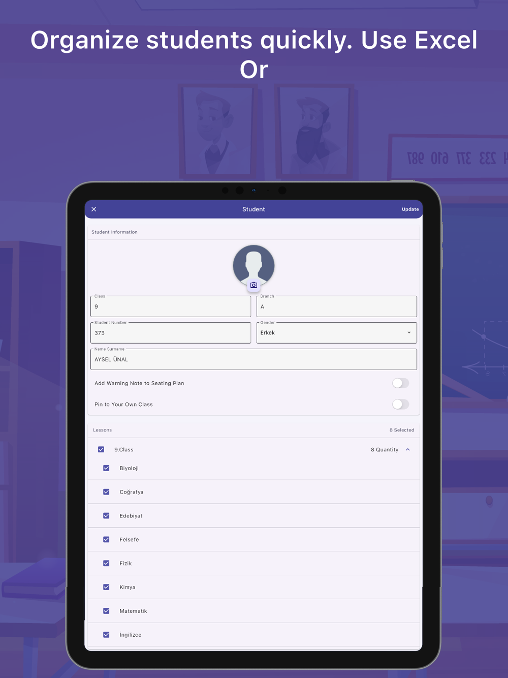 * You can create the seating plans by optionally selecting the student number, name, surname, class, photo, course name fields.