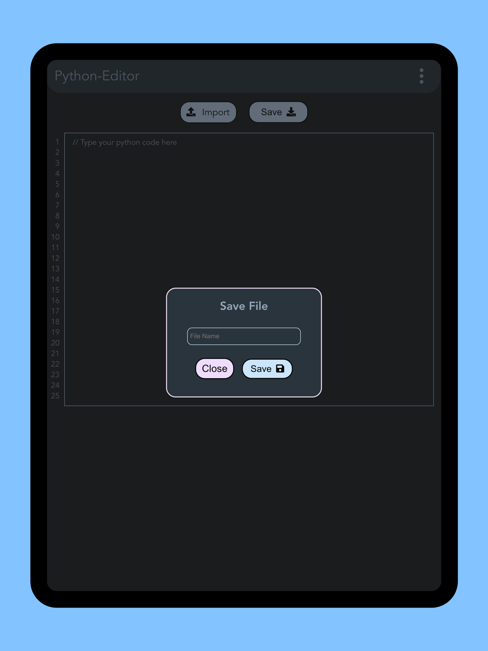 Python Editor is a simple and powerful app for creating, editing, and saving Python files on your device. With its user-friendly interface and essential features such as syntax highlighting and import/export, Python Editor is the perfect tool for anyone who needs to manage their Python code. Whether you're a student, developer or just need to write down some code, Python Editor makes it easy to write and test Python code on-the-go or at home. Download Python Editor now and experience the power of effortless Python coding!
