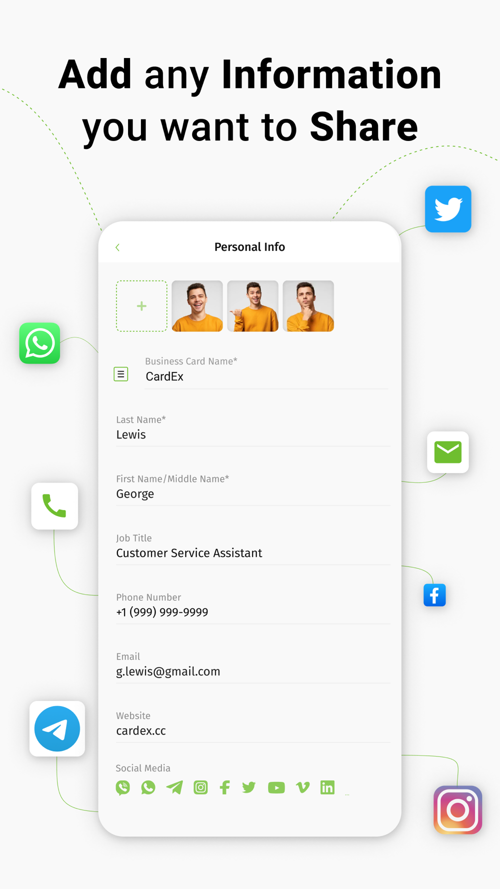 Have your card look great in chat apps. Send your digital business card directly to any messaging app. It will be displayed as a stylish card with your profile photo.