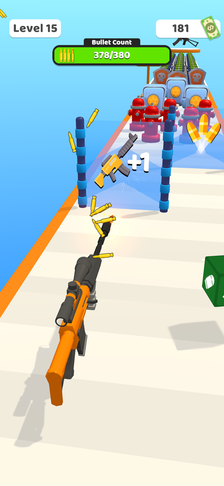 Smash objects and earn money to buy chests and merge them. Upgrade your weapon with more chests. Don't forget to tap to shoot faster!