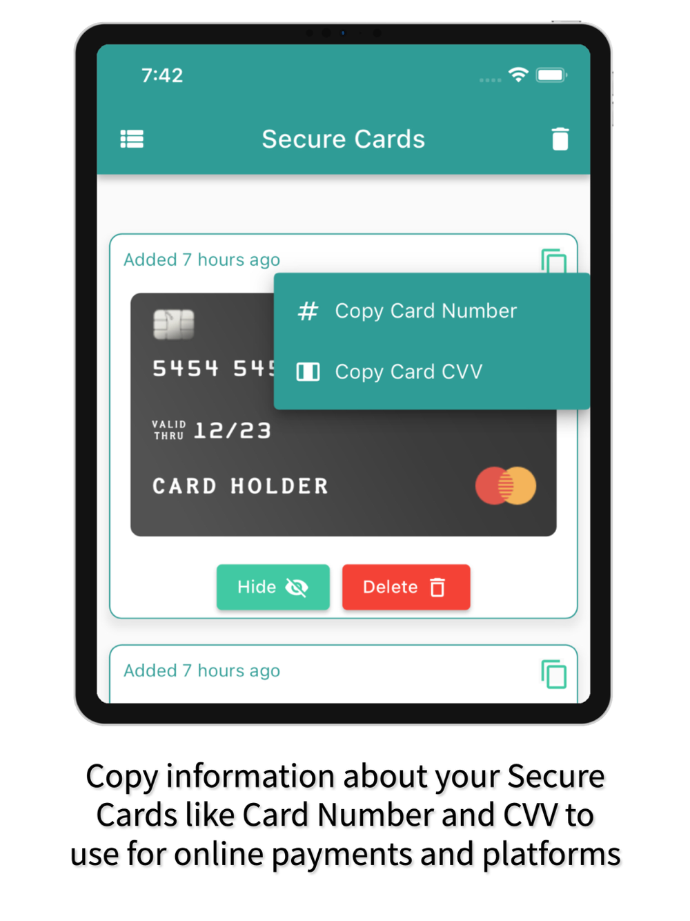To enhance convenience, BiometriCard allows you to easily copy your virtual card details for quick access during online payments. Once authenticated, users can effortlessly copy the necessary information, streamlining the payment process and eliminating the need for manual data entry.