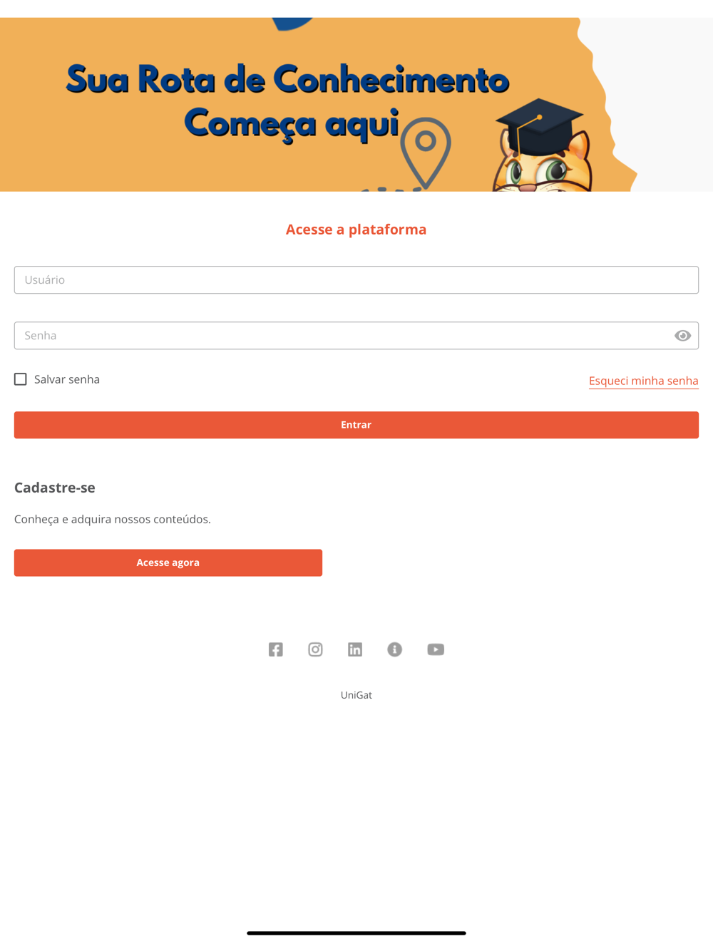 Aqui na Unigat você encontra: trilhas de treinamento, cursos livres, livros e muito mais. Unigat - Sua rota de conhecimento começa aqui!