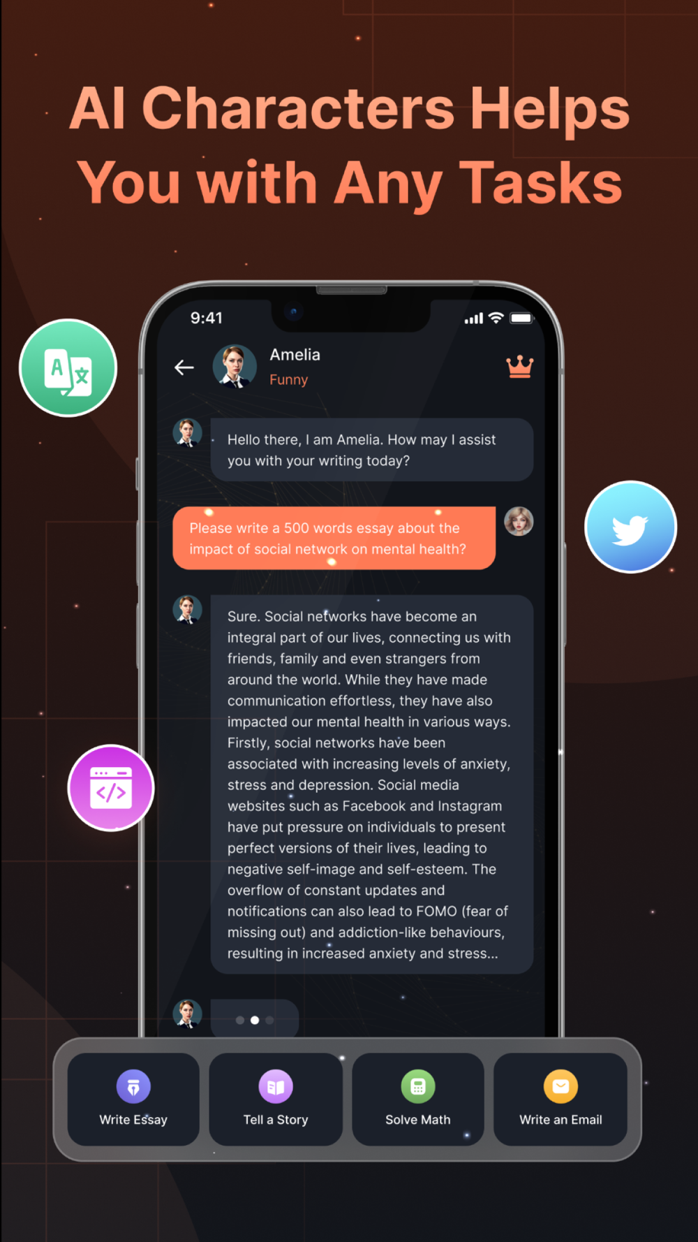 In addition to the captivating chat experience, the app also offers an AI Assistant to assist you with a wide range of tasks. Need help with essay writing? The AI Assistant is here to provide guidance and suggestions. Stuck on a math problem? Let the AI Assistant solve it for you. With AI Chat Character, your personal AI Assistant is always ready to lend a hand. Choose from hundreds of AI characters, each with their own unique traits and backgrounds, guaranteeing a diverse and enriching chat experience.