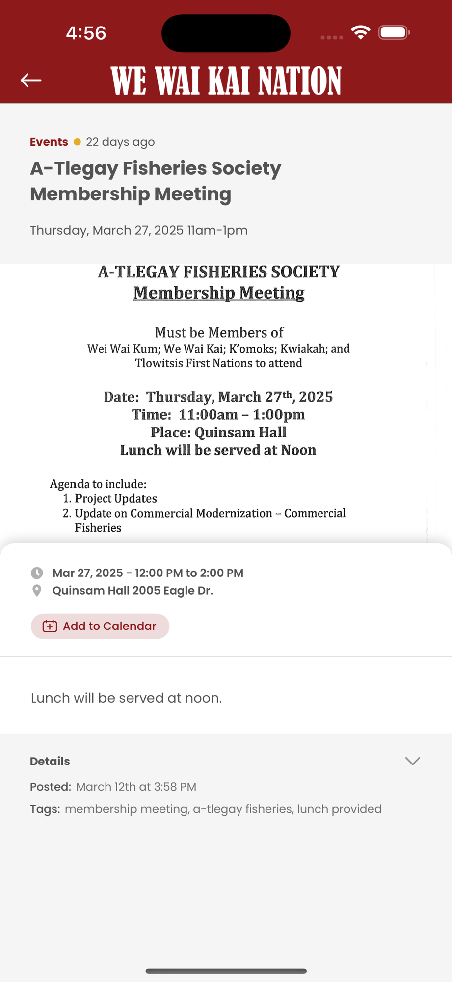 Welcome to the App of the We Wai Kai Nation! We have developed the We Wai Kai Nation app to be a communications platform for our community. Our app helps We Wai Kai Nation staff, community members, band members, and the general public to keep up with what's going on around the Nation.