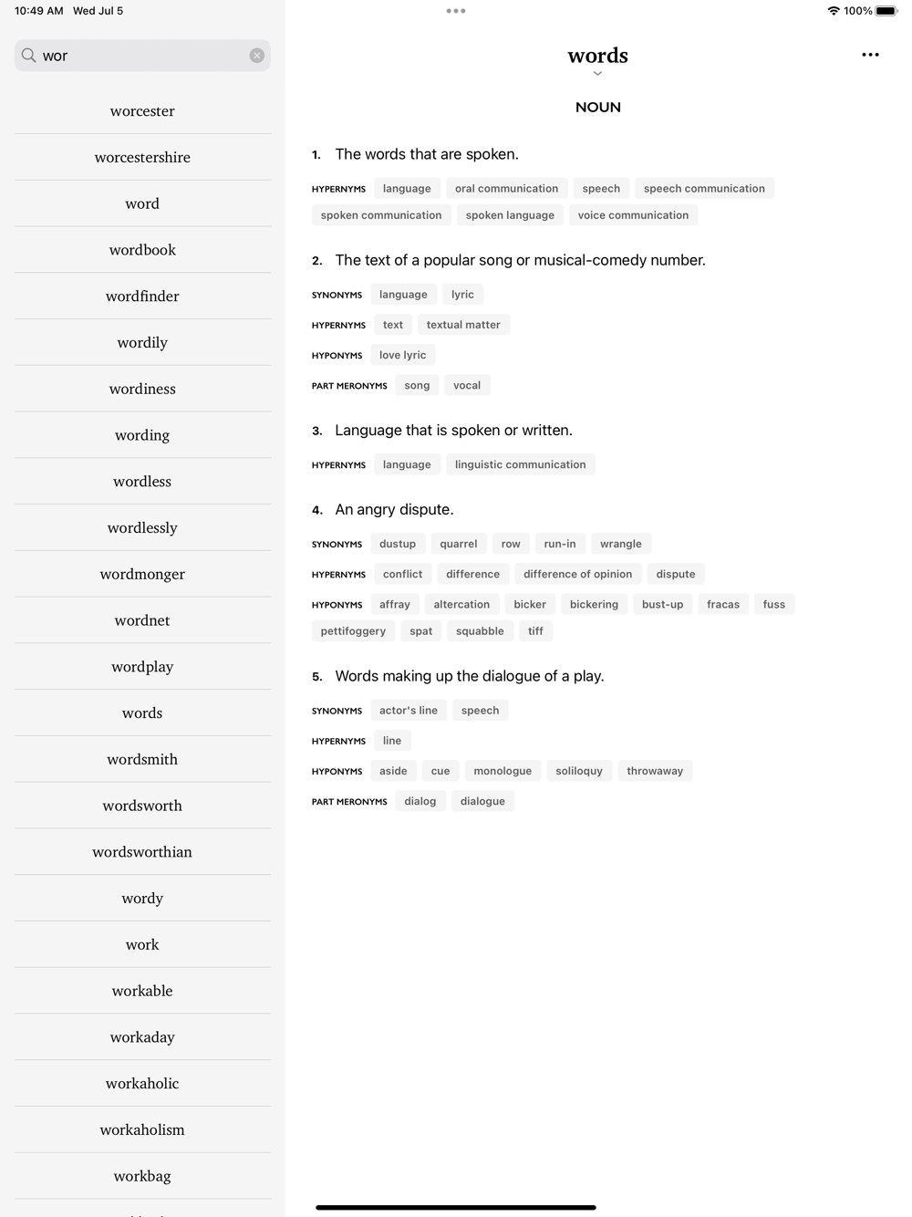 Dictio is a bit of a mix between a dictionary and a thesaurus. It uses the awesome content from the WordNet Project by the Princeton University and we have packaged it into a minimalistic, fast and easy to use app for iPad and iPhone.