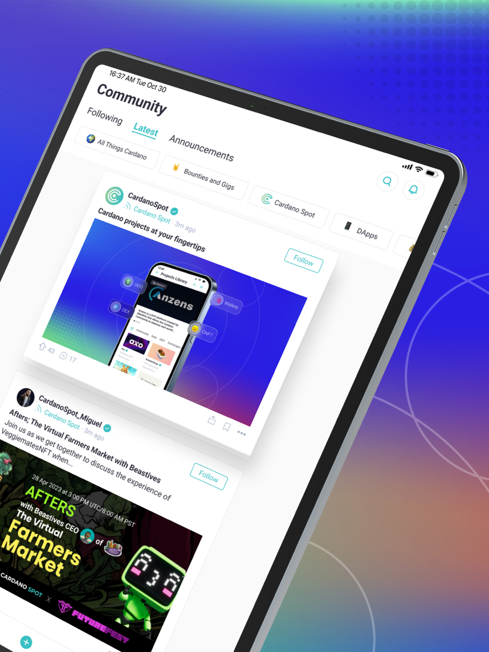 Cardano Spot is the ultimate guide for enthusiasts, investors, developers, and content creators in the dynamic world of Cardano. We recognized the need to address the issue of fragmented information in this fast-paced industry and thus created a social media platform that offers a 360-degree overview of the ecosystem, serving as a trusted and user-friendly source for everyone.