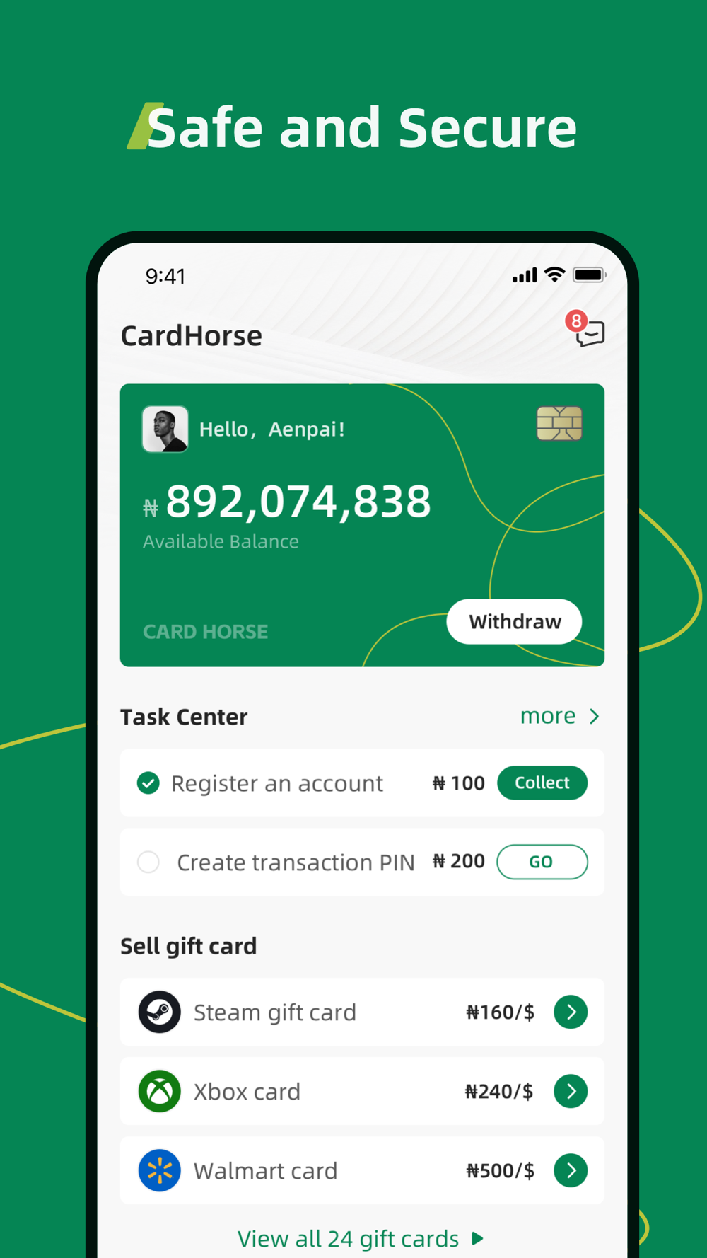 We support the sale of 25+ gift cards for naira, in addition to which we have a wealth of new user activities to claim a large number of new user rewards.