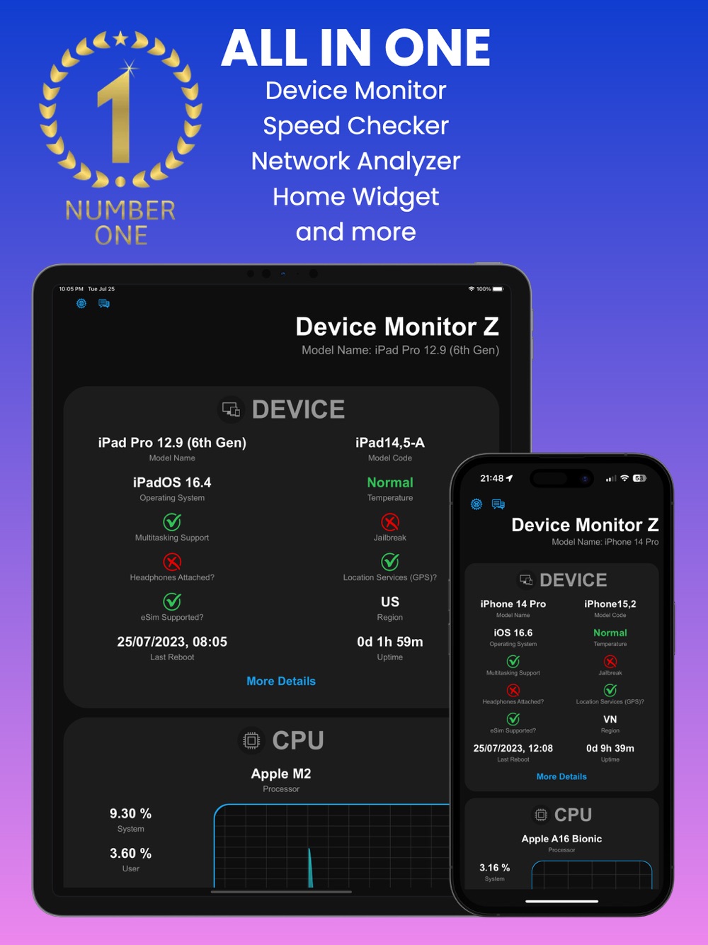 Discover the power of our app - Device Monitor Z (also known as iDevice Monitor) is an app optimized for iPhone, iPod Touch, and iPad users. It provides a quick and efficient way to access activity monitor (CPU monitor, detailed RAM, Storage space, ...) and system information of device.