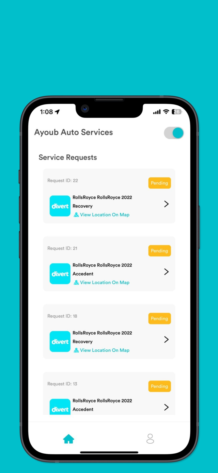 Divert is a cutting-edge service provider booking application designed to streamline the reservation process. With Divert, service providers can easily receive and manage bookings submitted by users through the app, ensuring a seamless and convenient experience for both parties.