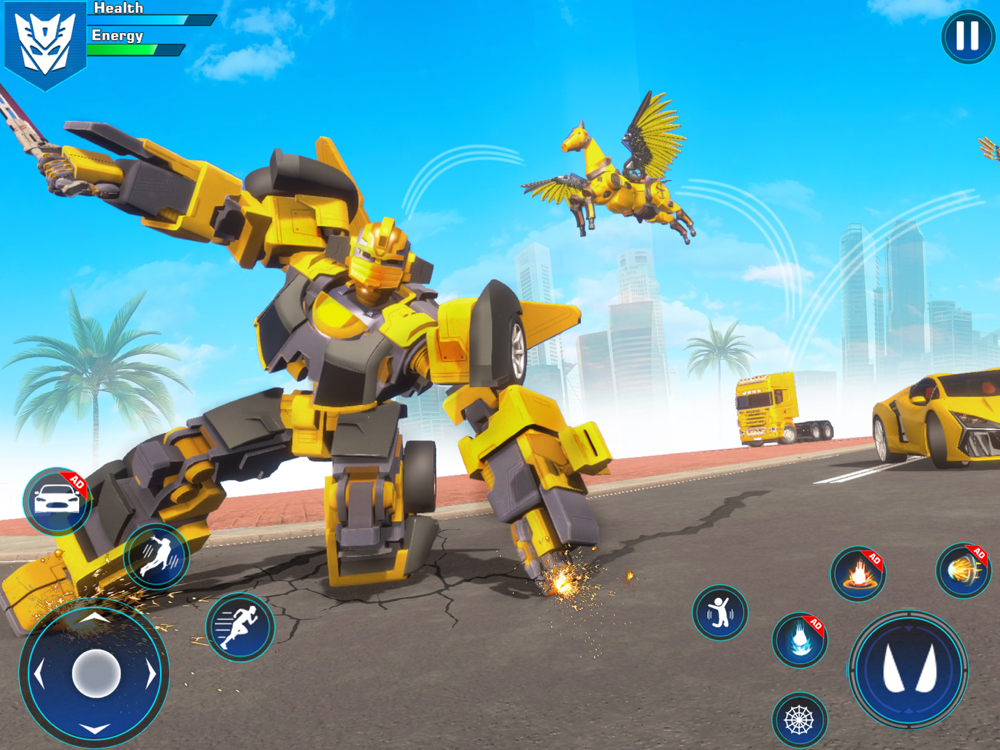 The flying robot car transformation game has a unique and engaging gaming experience with a combination of car driving, car flying, and robot fighting, and requires quick strategic thinking to succeed. Defeat enemies in a powerful robot car simulator game. Enjoy dangerous laser beams which come from robot eyes to crash robot enemies with powerful hands.