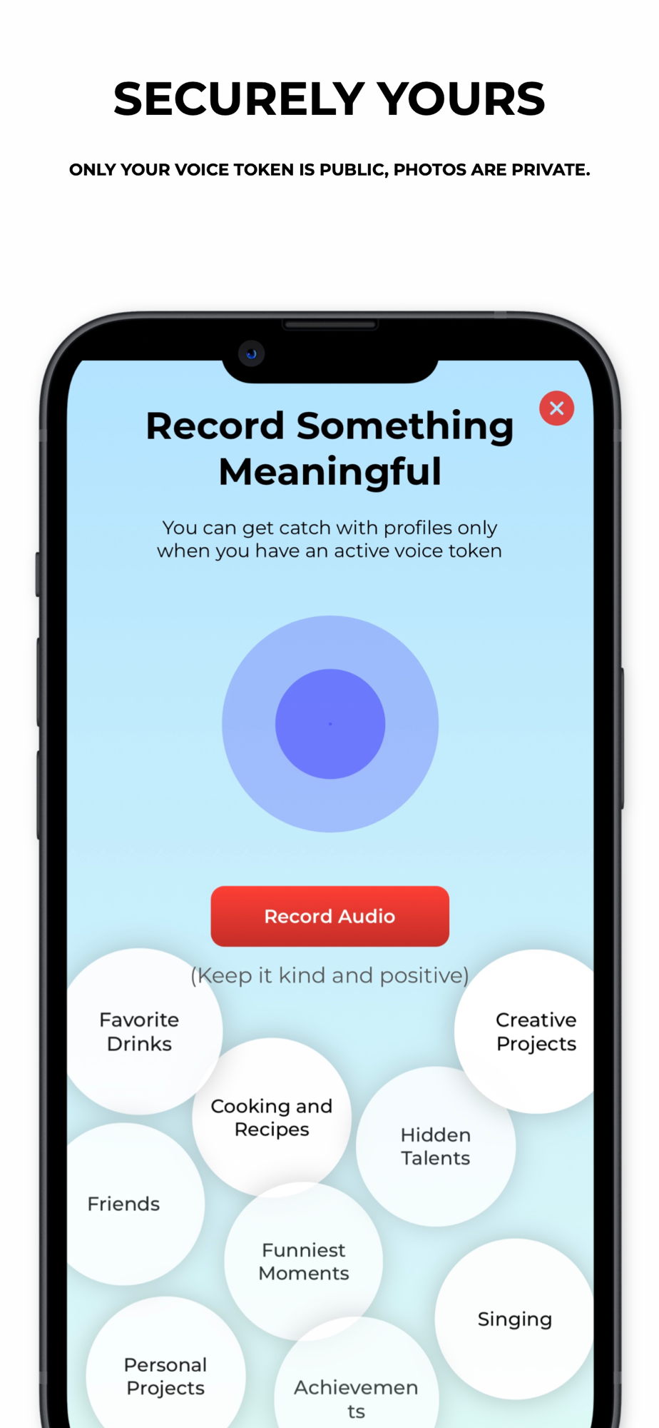 Only your voice token is public. Photos remain hidden until there’s mutual interest. You’re always in control of what you share and when.