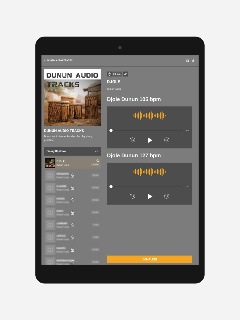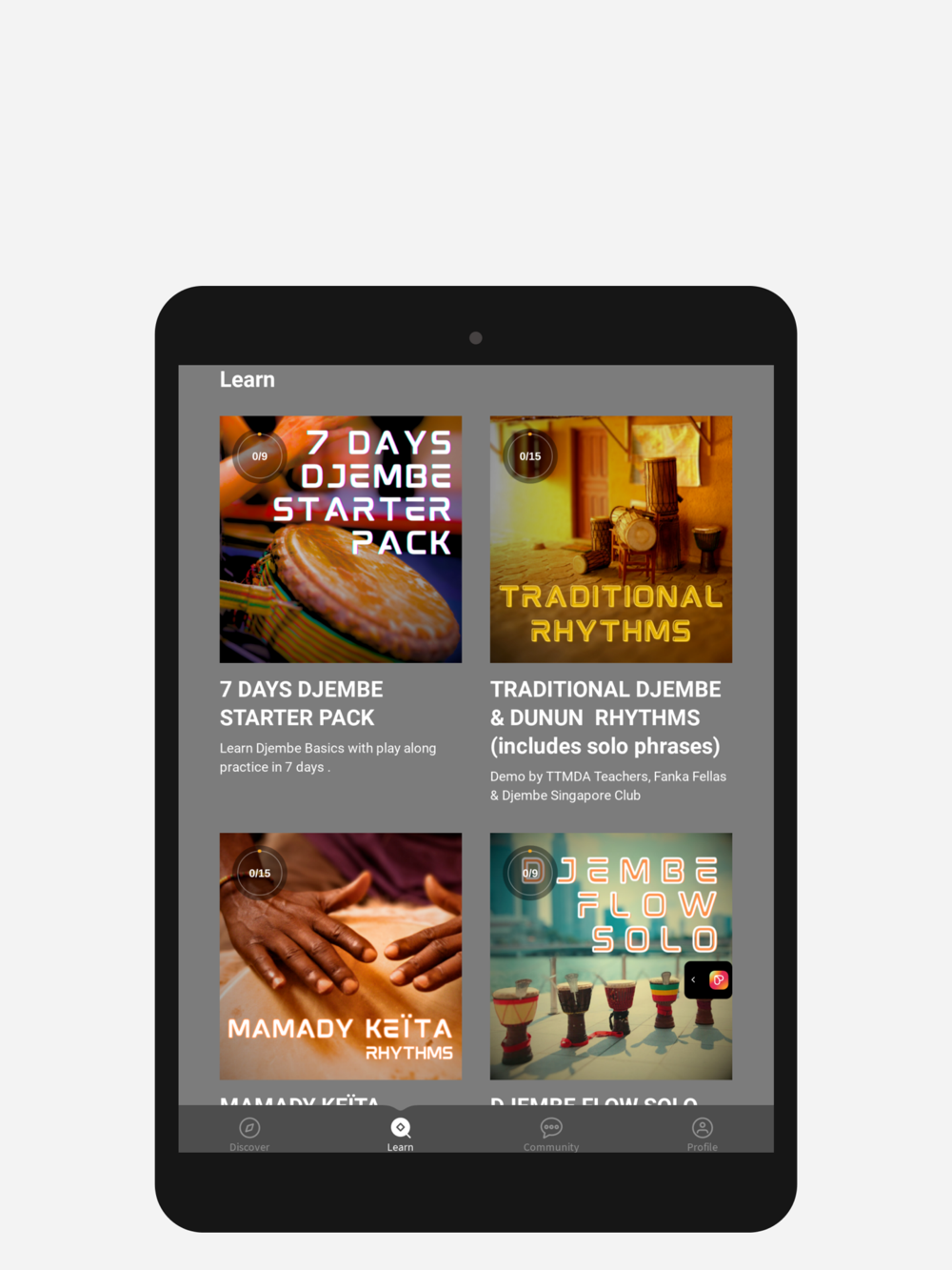 Rhythms, Solos, Audio Tracks with new content updated every month. Whether you are a student or teacher, this can be your go-to reference for djembe playing contents. All in the convenience of an app in your pocket anytime, anywhere.