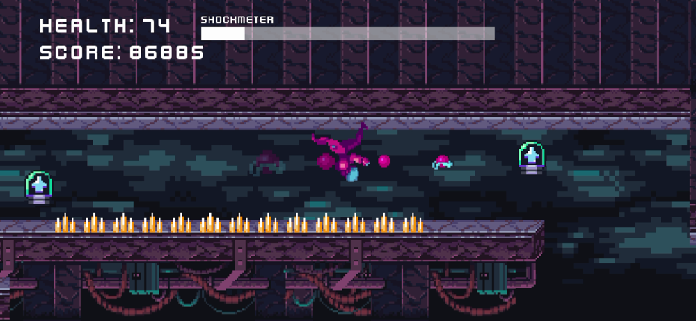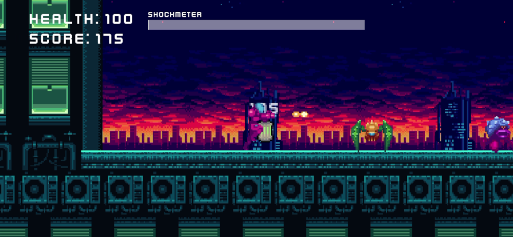 This run-and-gun platformer is reminiscent of classic 16-bit shooters and includes a half a dozen varied and exciting stages, fast-paced action, a cool Shock Attack mechanic to wipe all the enemies off screen, antigravity platforming challenges, and an epic boss battle at the end, all with a pulsing drum and bass soundtrack.