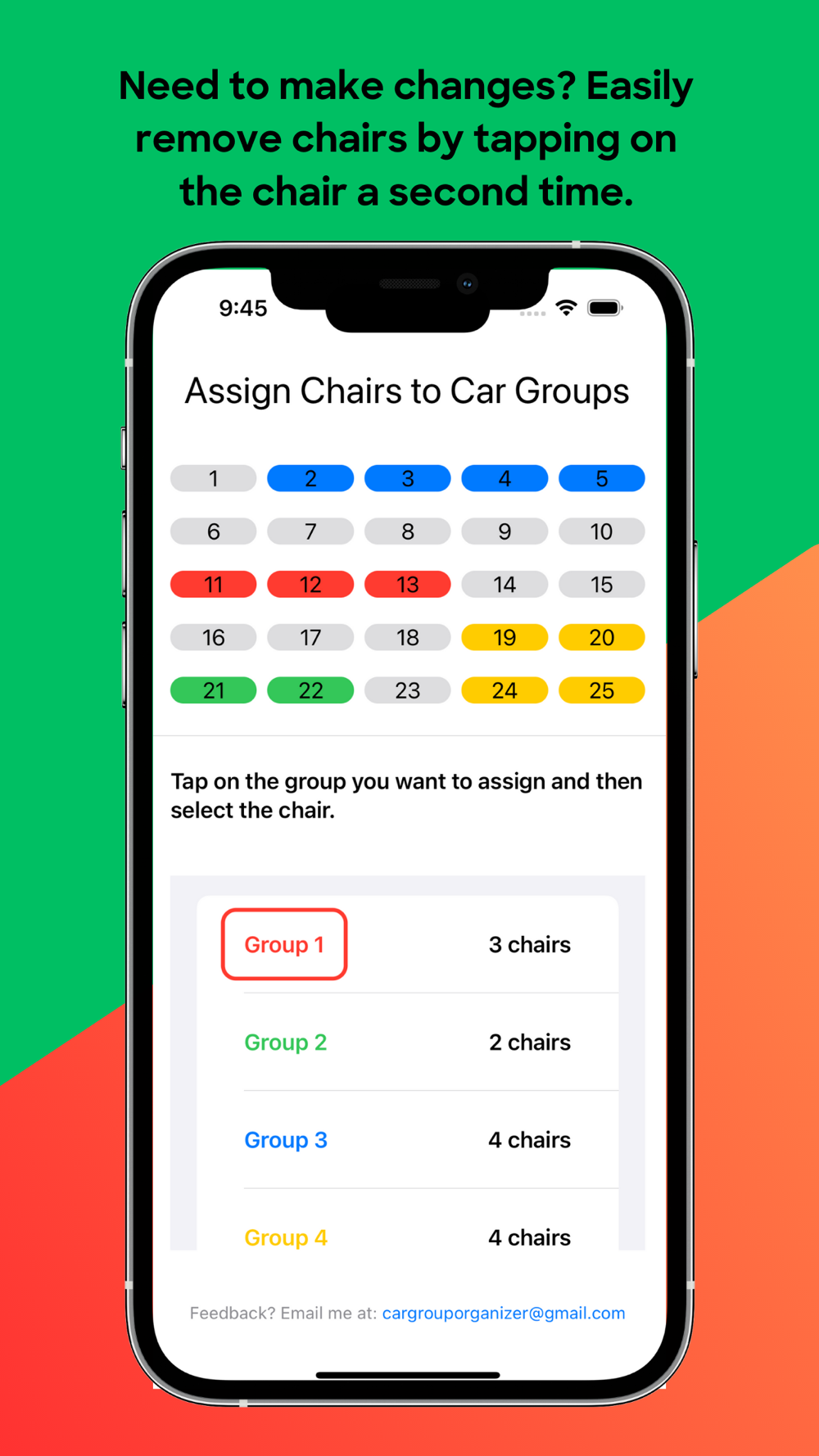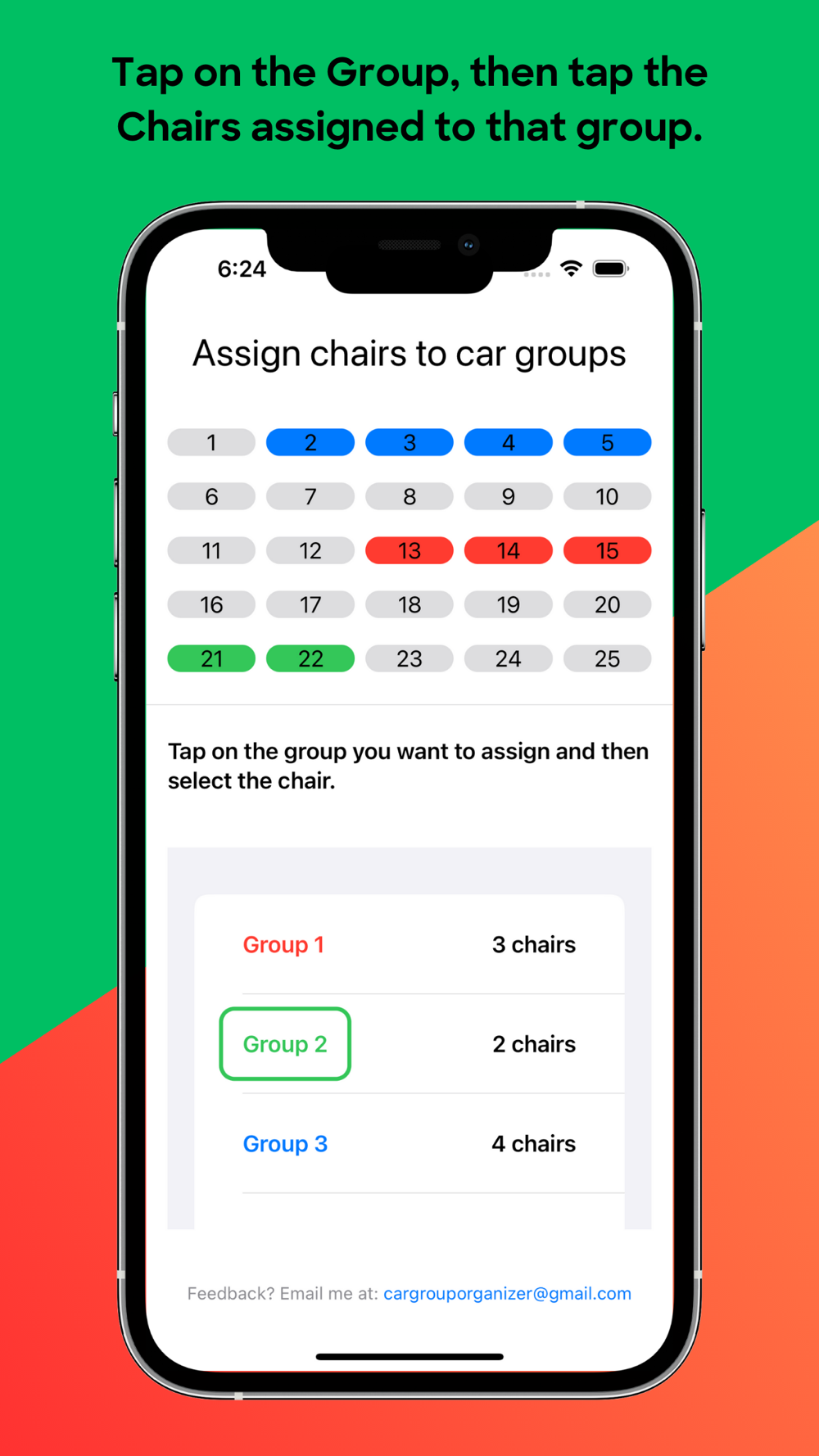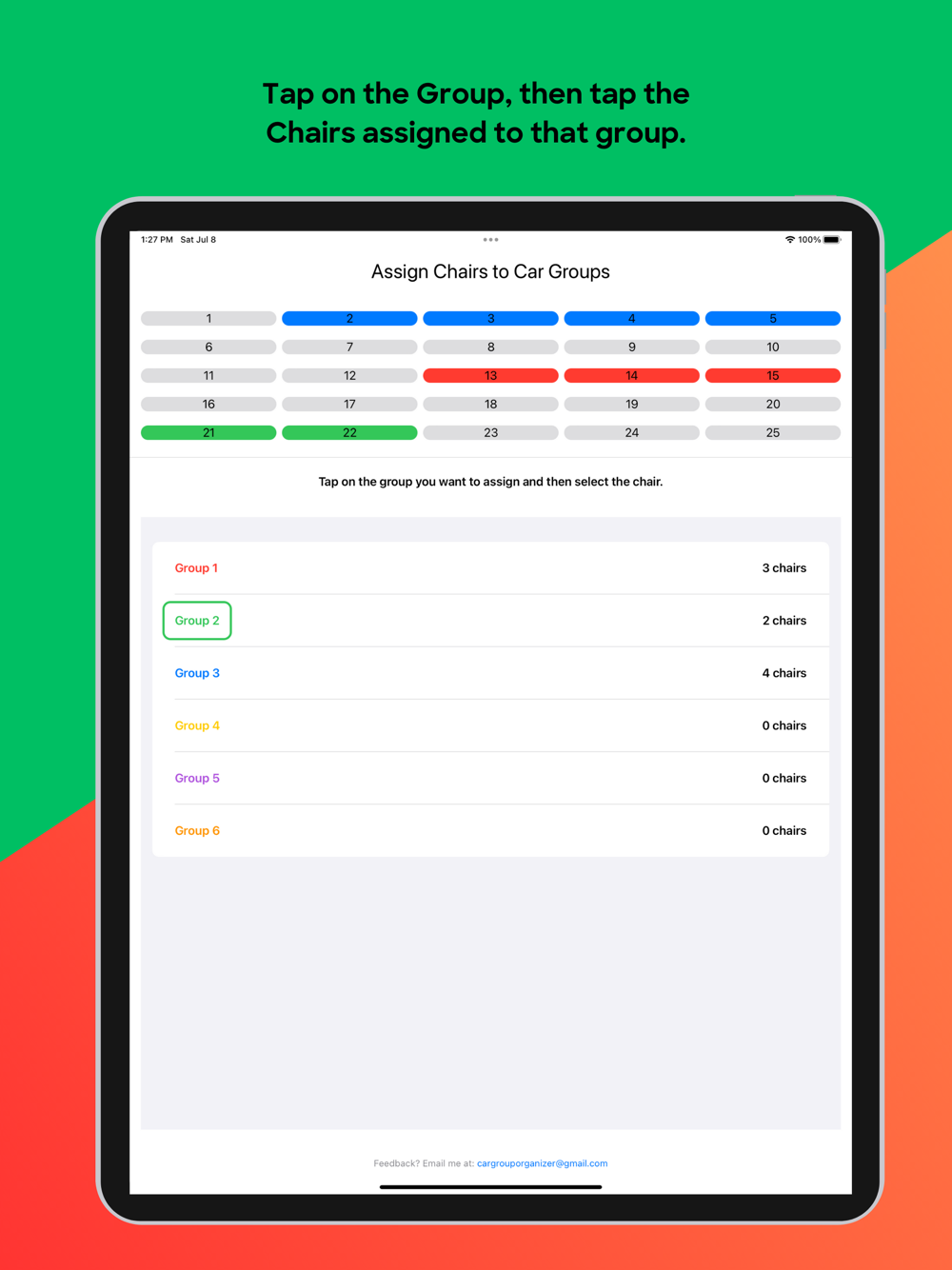 How does it work? Easily tap the Group that you want to assign, then tap the chair(s) that should be assigned to that group. If you need to make a change to a group that a chair is in, no worries, just click on the chair again to remove it from the group. An updated total of how many chairs that are assigned to each group is automatically calculated on the lower side of the screen.