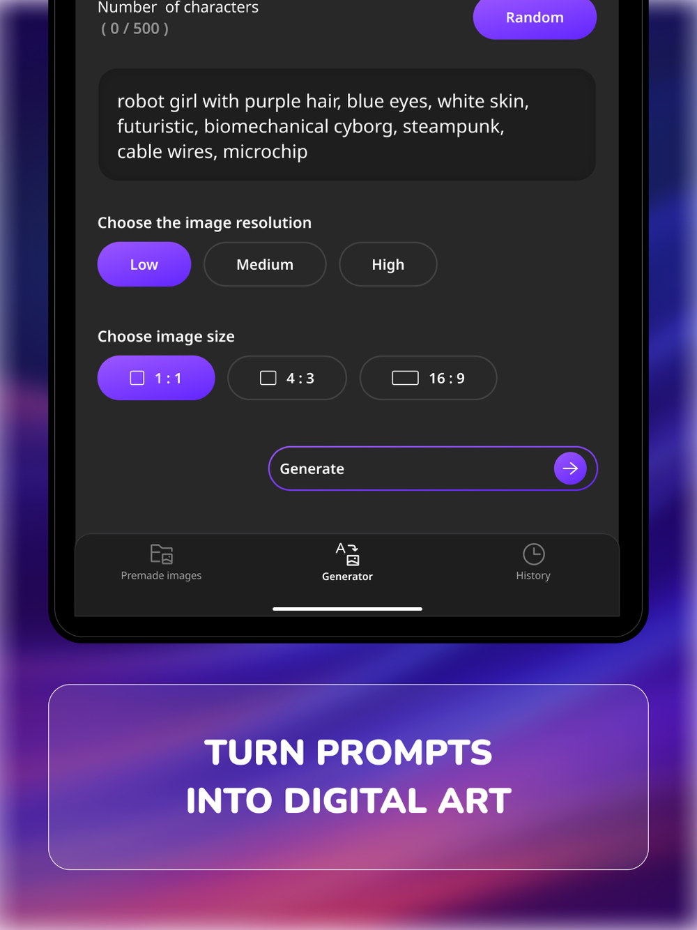Embrace the limitless possibilities of generating high-quality images effortlessly, whether through your own descriptions or with the help of pre-prepared prompts. Describe your desired wallpaper in detail, and watch the AI instantly generate a picture that perfectly captures the essence of your request.