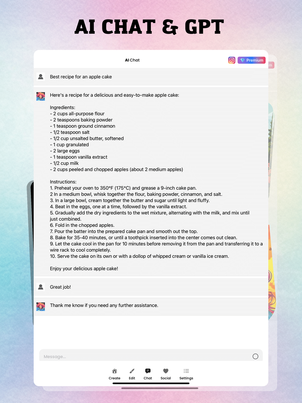 Communicate, create, and clarify with Chat GPT. Integrated into the app, Chat GPT lets you describe your artistic vision in natural language. The AI uses your input to drive the creative process, forming a digital art piece that reflects your thoughts, mood, or concept.