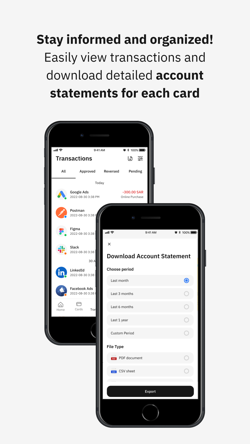 Track and manage expenses with ease using our innovative card system. Register your employees and effortlessly create both virtual and physical cards, enabling them to make purchases while seamlessly submitting invoices and receipts directly within the app.