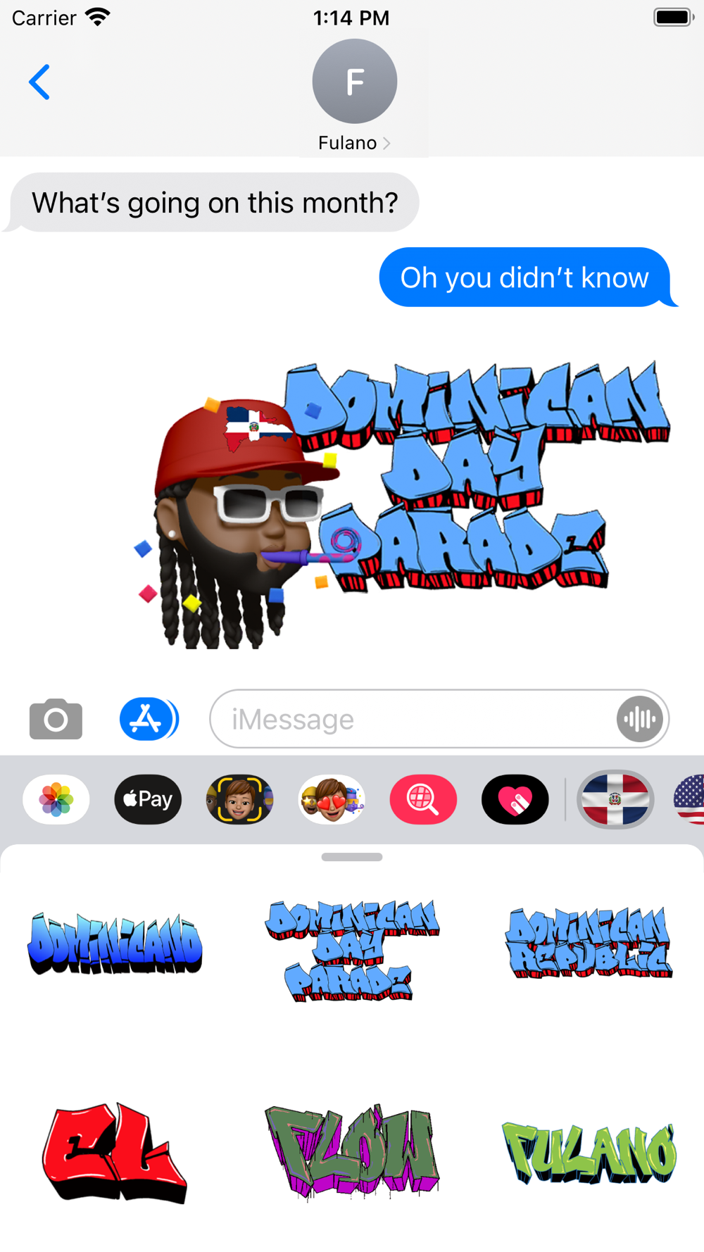 Show your Dominican pride via iMessanger and Memojis with this fun Dominican Republic Day Parade Sticker Pack. It comes with Dominican Republic Flags, Hats, T-shirt designs and more to put on your Memoji or even Graffiti Words on text. This app will have more addtions as we will continue to update to trend. Feel free to leave comments on the reviews if you would like to see anything added to the app to represent the Dominican Republic & Dominican Pride.