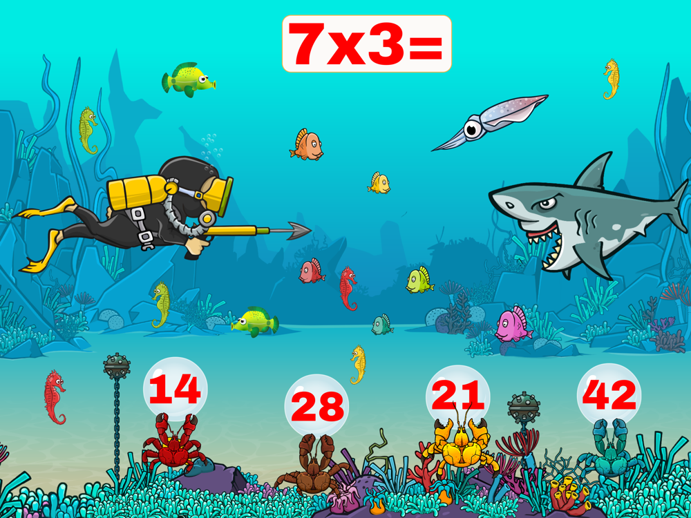 Dive into the exciting world of multiplication with MathDive, the fun and educational game that teaches kids the times tables! Join our brave diver as he explores the colorful depths of the ocean, encountering a variety of sea creatures with multiplication problems to solve.
