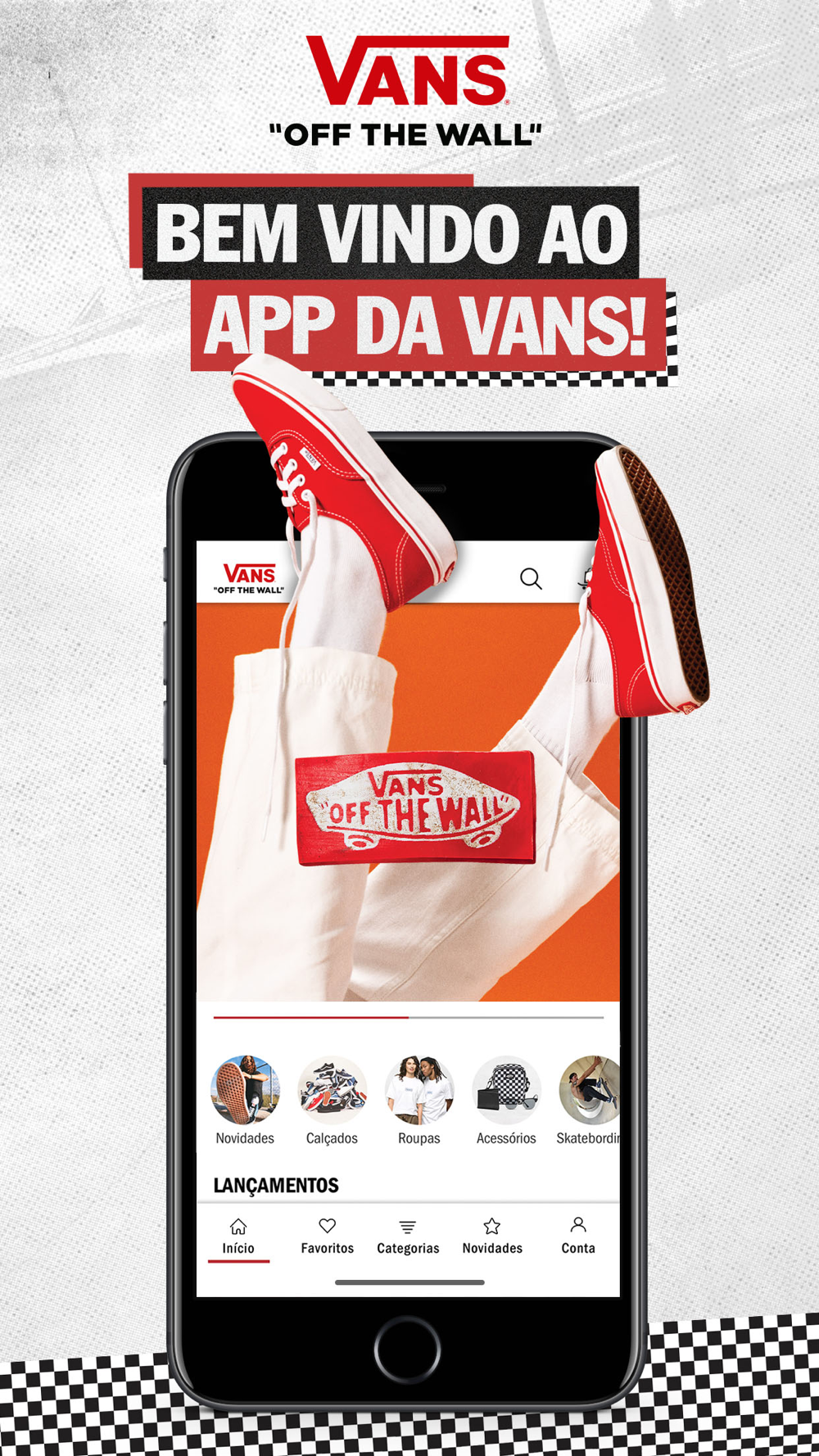 No app da Vans você receberá em primeira mão os lançamentos, novidades, conteúdos exclusivos e promoções onde você estiver com o seu celular. Isso é OFF THE WALL!