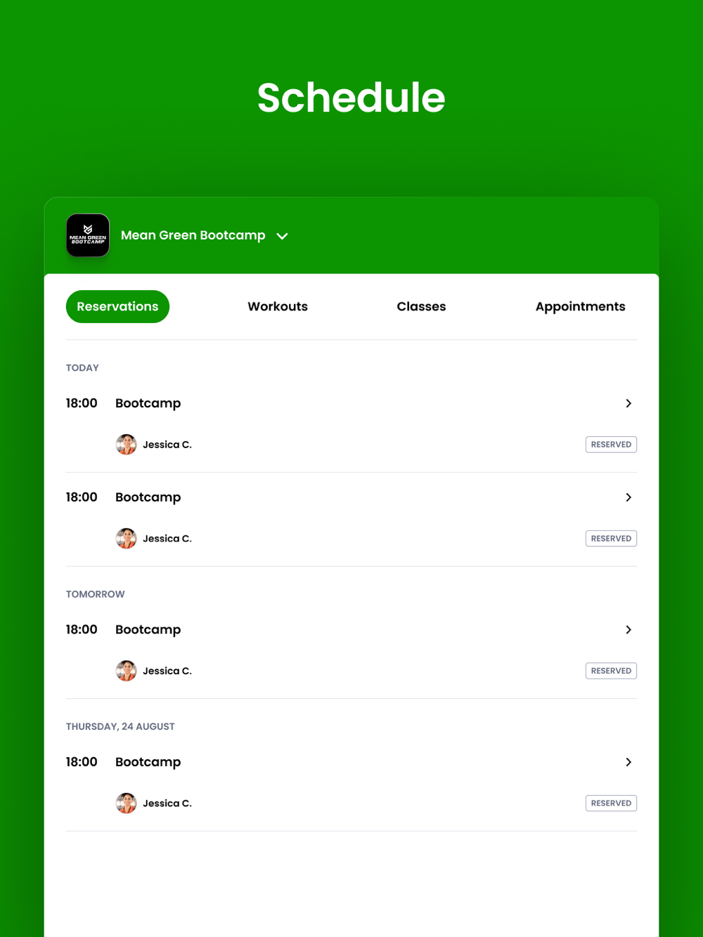 For members of Mean Green Bootcamp to reserve their place in a class, sign up for gym events, and general account management like updating headshots and credit card on file.