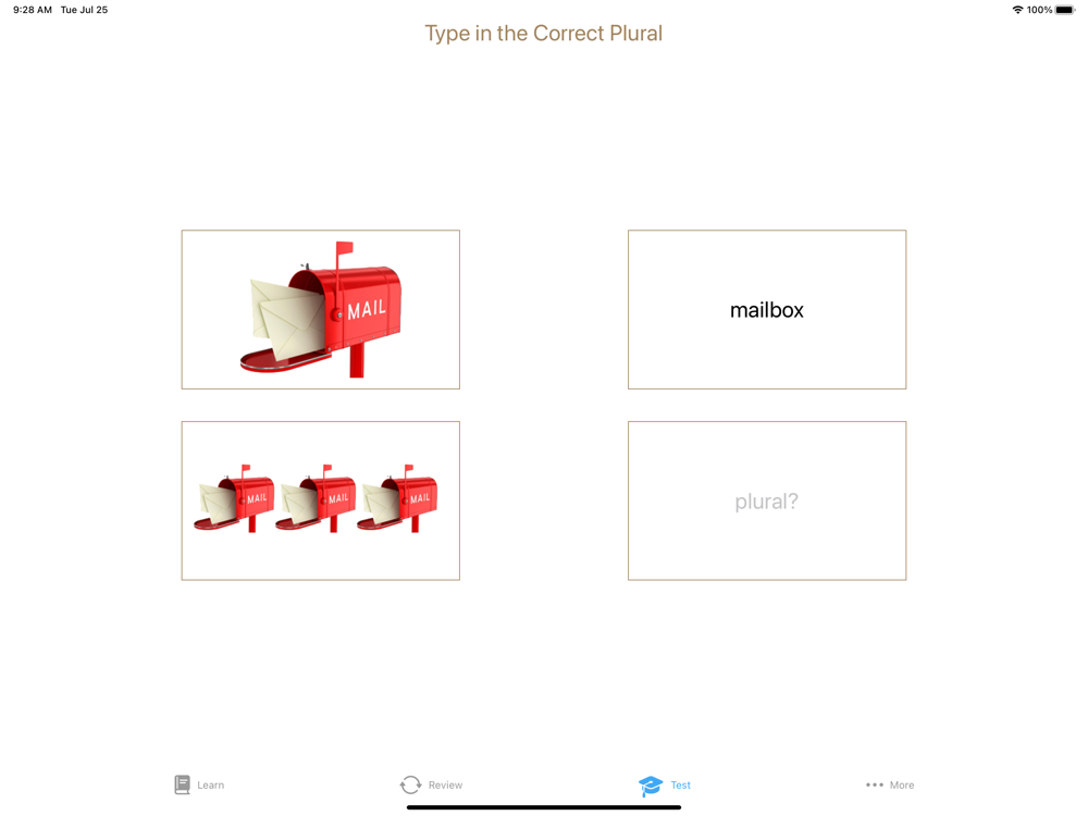 Practice and master 60 plural endings. There are ten nouns in each of the follow categories: -s, -es, -ies, -ves, no change, and oddball.