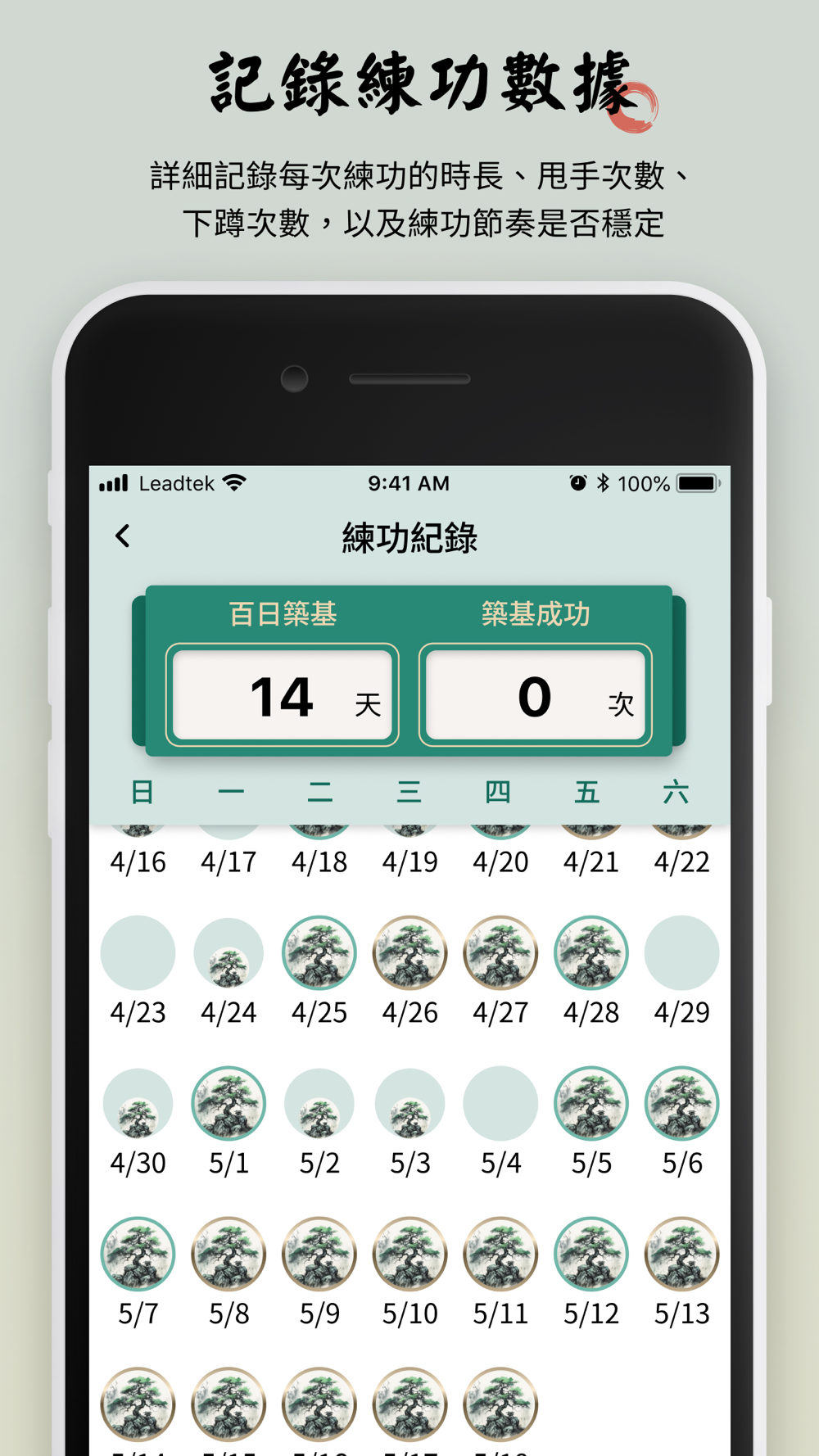 利用 amor RingSwing 除了可以記錄練功的時間還有每日練功的目標,同時提供身心活力記錄功能。其中練功的詳細參數包括: 練功的時間、甩手次數、下蹲次數,以及練功的節奏是否規律。在練功部分,根據樹的大小來判斷是否有達到每日目標,並朝著百日築基的方向前進。在身心活力部分,根據太極的大小來判斷生理年齡的大小,也可以提供練功對於生理年齡影響的參考。