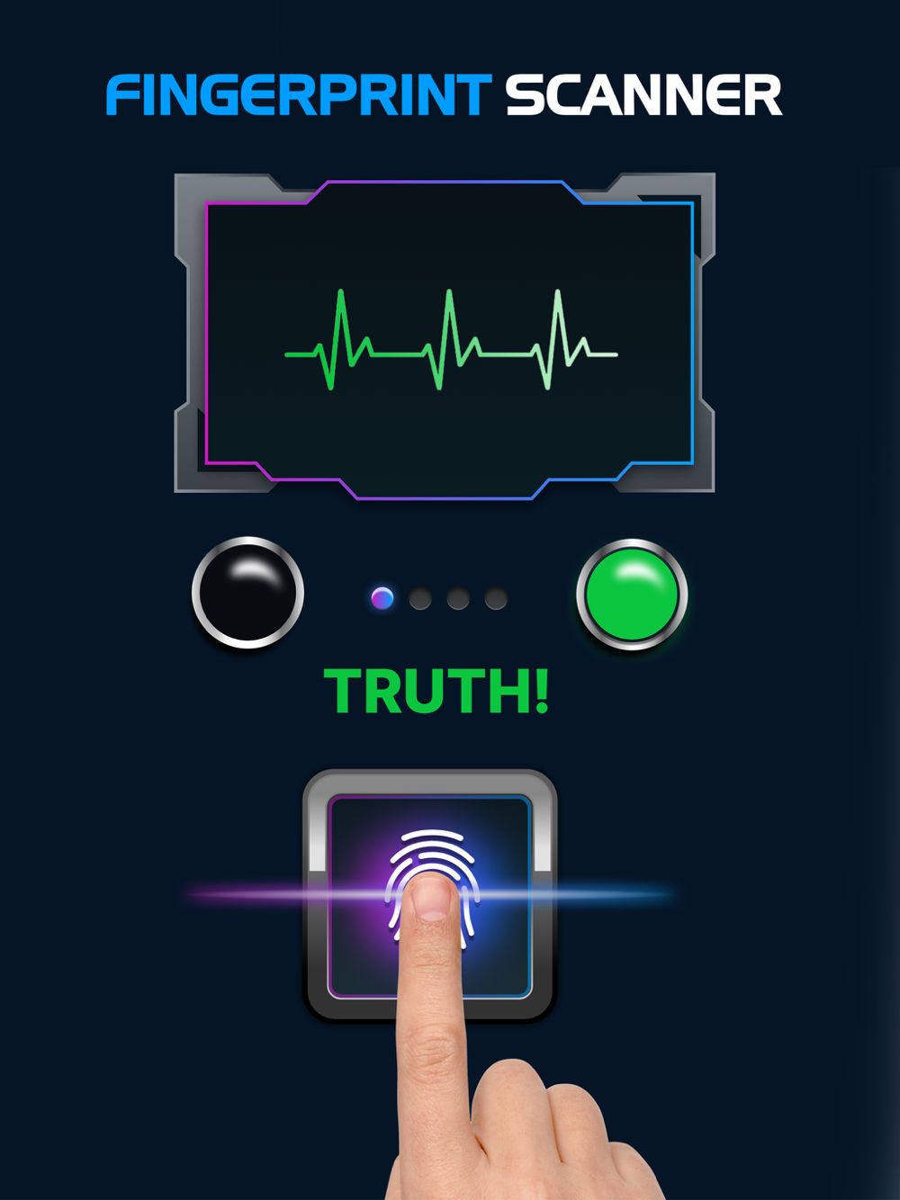 The application simulates a fingerprint lie detector. Have fun with your friends in this lie detector prank. Ask them a random question, then place their finger on the screen to scan the fingerprint and answer. Our application will have a timeout that simulates the analysis. Then, the screen will display a message about whether you are telling the truth or lying. Imagine the look on people's faces when they believe you can tell if they're being honest or trying to cover up a lie.
