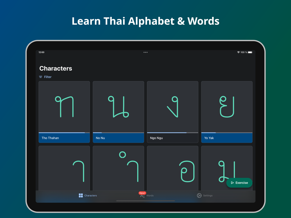 Dive into a series of exercises that will guide you through the intricacies of Thai characters. Each exercise is designed to reinforce your recognition or improve your reproduction skills.