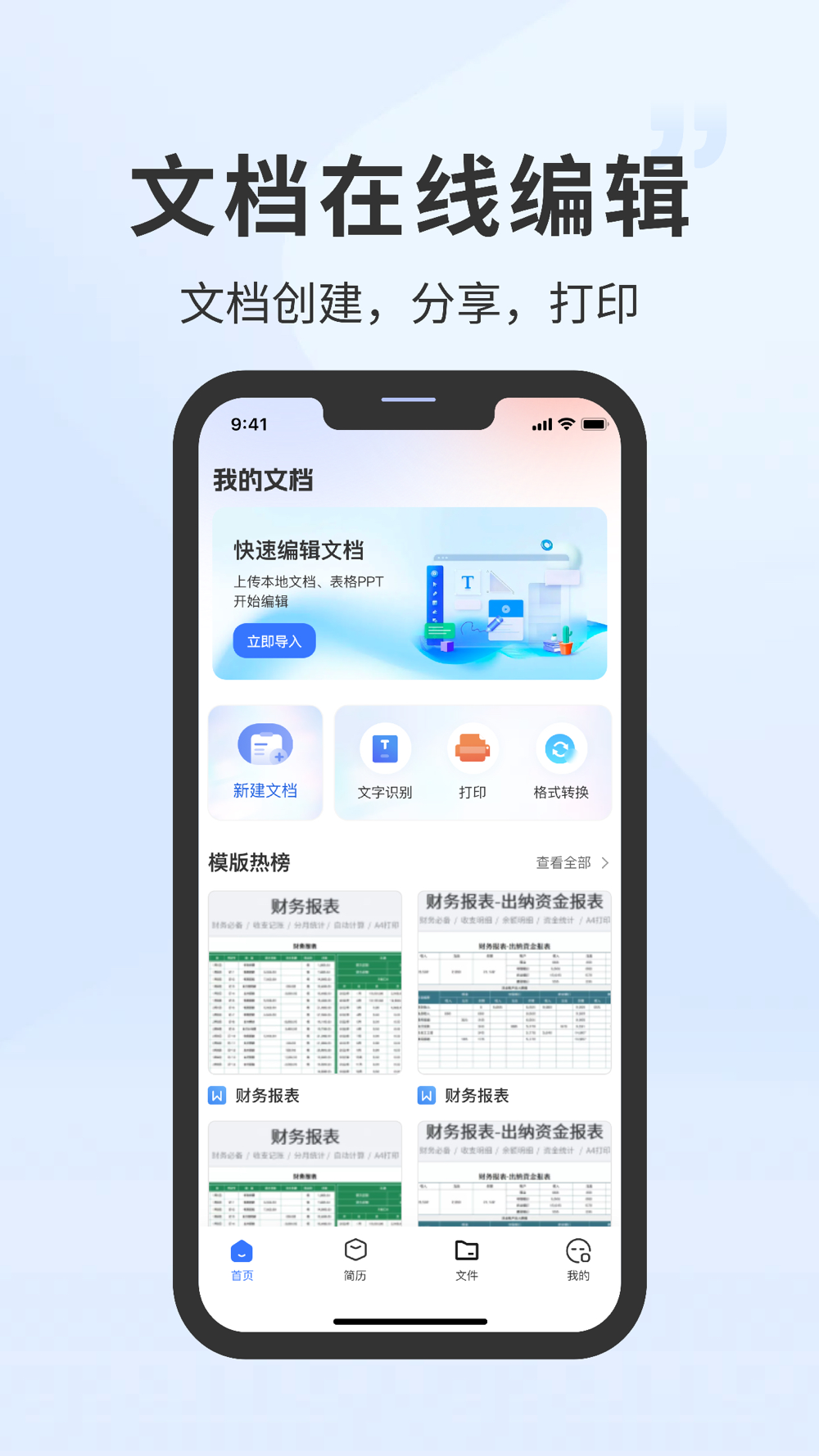 文档手机版为用户提供移动办公的需求。主要功能包括文档的在线创建和编辑、文档转换、简历一键制作、文档模板使用等功能。