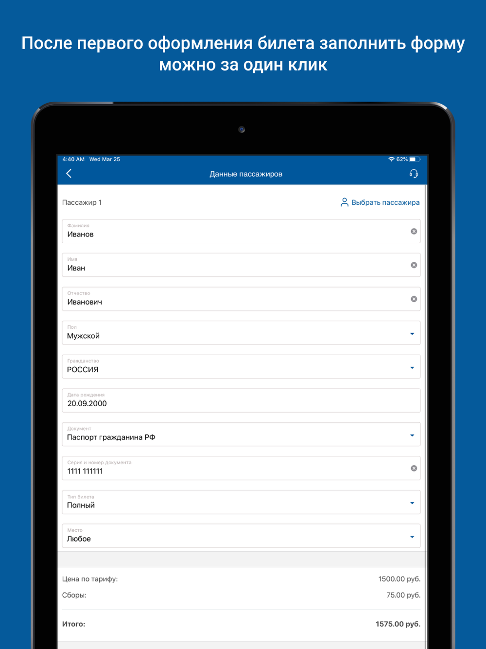 - автоматическая подстановка данных пассажира при последующих покупках электронных билетов