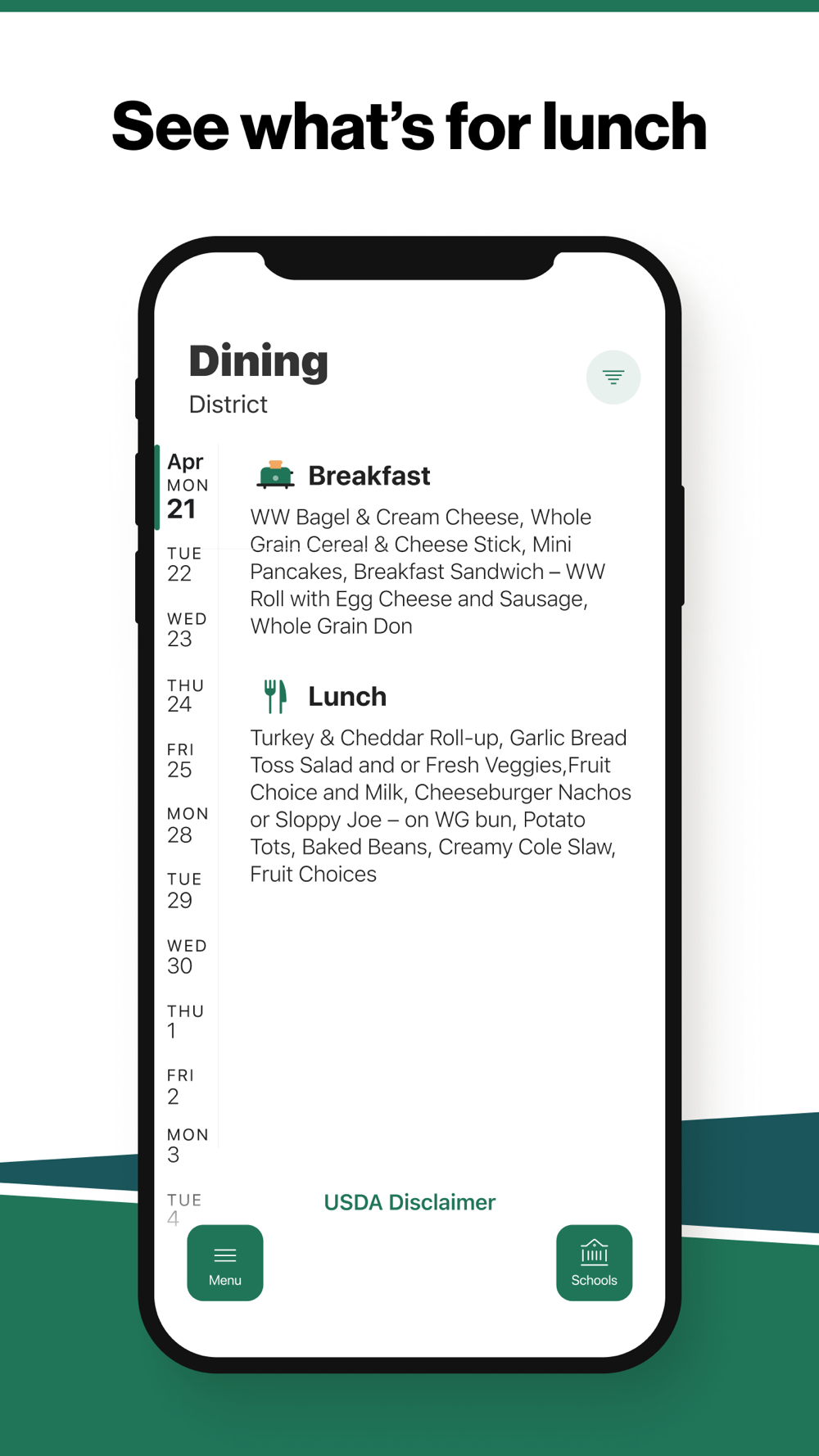 Within the dining section, you'll find an easy to navigate, weekly menu, sorted by day and meal type.