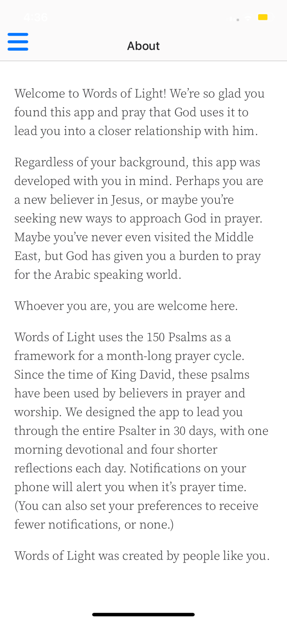 "Words of Light is a free 30 day prayer and devotional resource in English and Arabic, based around the book of Psalms to encourage you in your spiritual life and equip you to pray effectively for yourself, your family and your nation.
