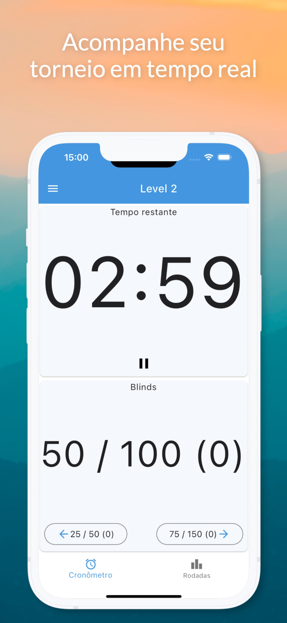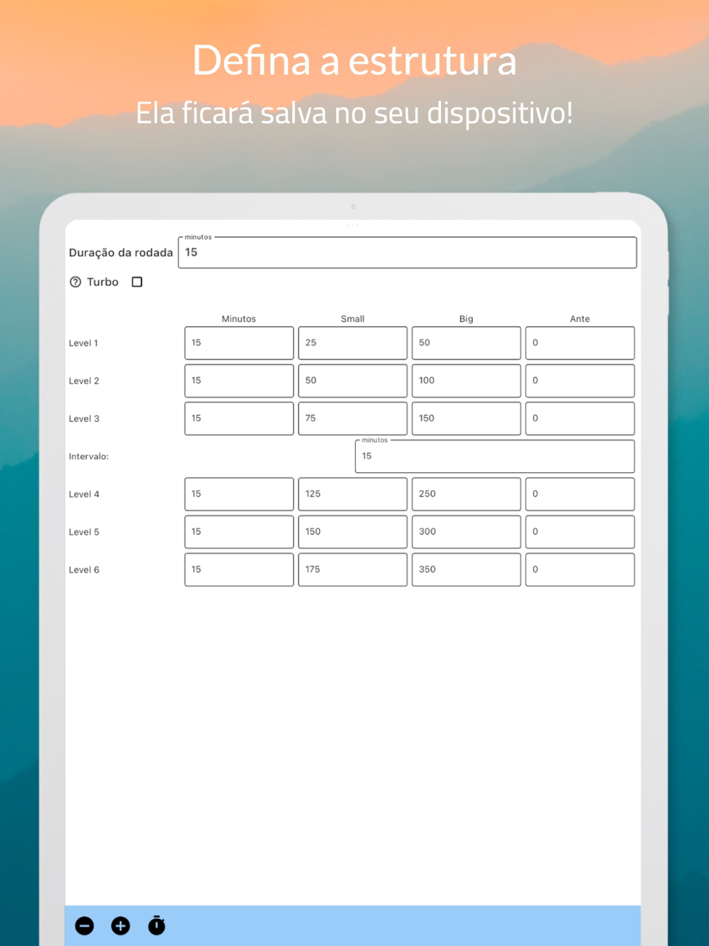 Estruture as rodadas do seu jogo, defina a duração e blinds de cada uma, acione nosso timer e agora é só jogar! O app vai emitir um som ao final de cada rodada.