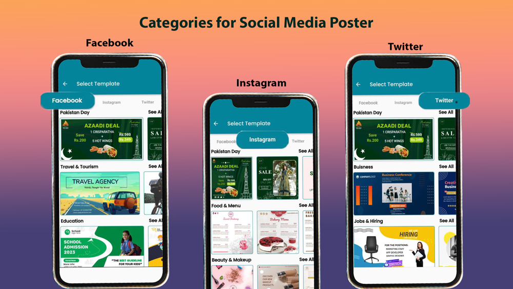 Through social media ads companies address the public through social media marketing. Social Media ad maker allows you to make quick and easy promotional ads with pre-designed templates for Facebook, twitter, Instagram & Snapchat.