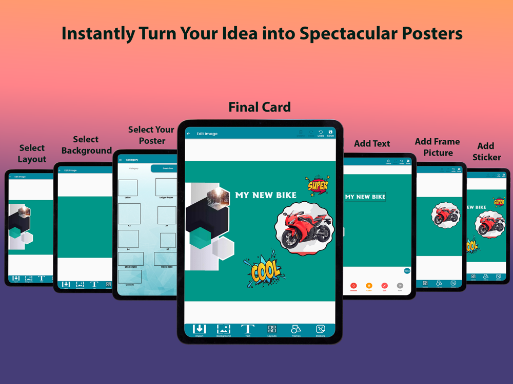 Are you ready to create your own poster? Poster Maker & Flyer Maker allows you to design your own personalized poster cost-free with minimal effort & time. Poster Maker & Ad maker is an all-in-one app allowing you to design cards & ads from blank or use a readymade template without watermark. Its text & photo editor toolbars help you to create ads with 5000+ templates, 1000+ text fonts, stickers & logo designs, 500+ backgrounds, texture, effects and an easy to use interface.