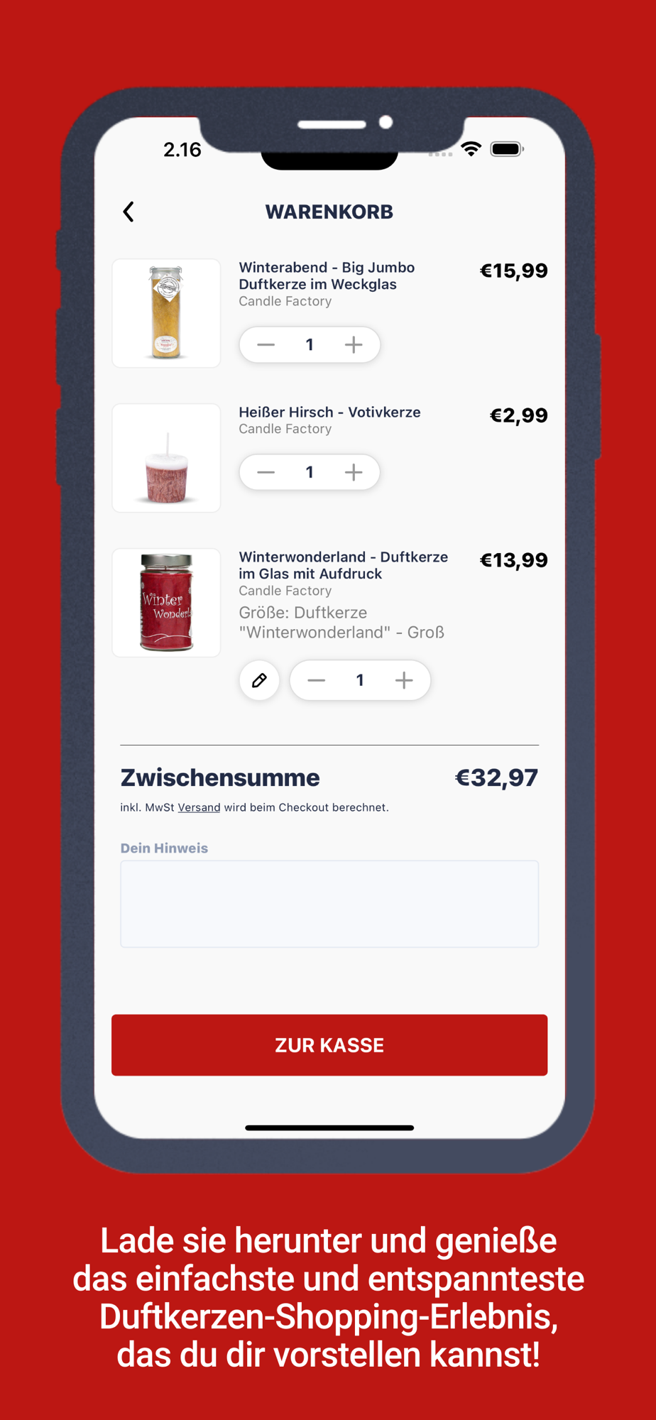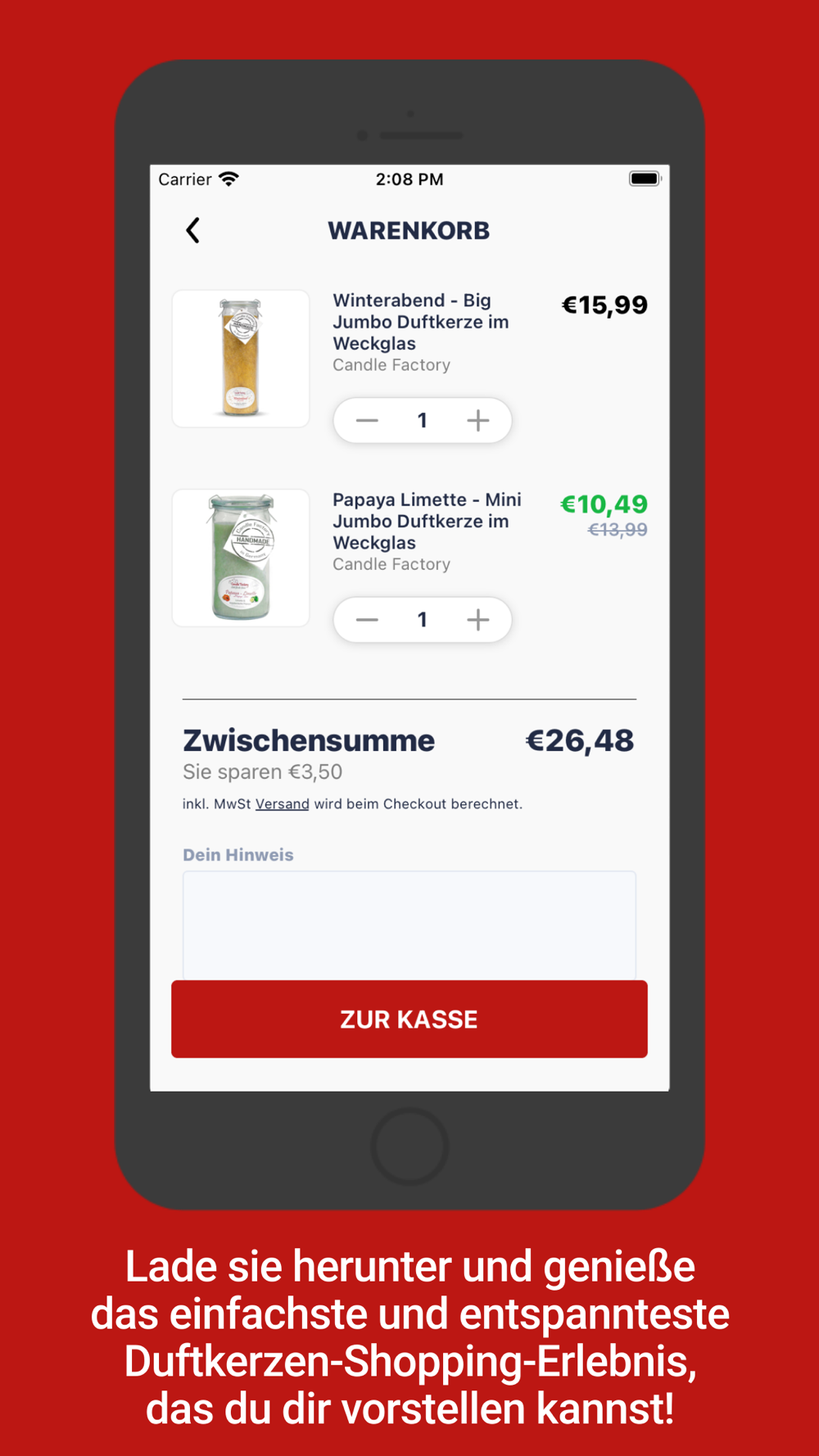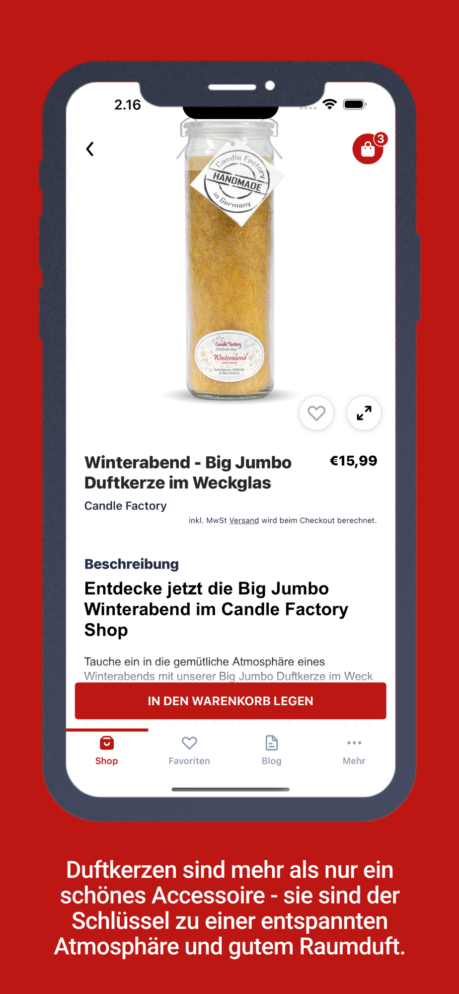 Mit unserer App kannst du unser riesiges Angebot an Duftkerzen und Accessoires durchstöbern und deine Lieblingsdüfte mit nur wenigen Klicks nach Hause holen. Finde alte Favoriten, entdecke neue Aromen und mach dein Zuhause zu deiner persönlichen Wohlfühloase. Duftkerzen sind mehr als nur ein schönes Accessoire - sie sind der Schlüssel zu einer entspannten Atmosphäre und gutem Raumduft.