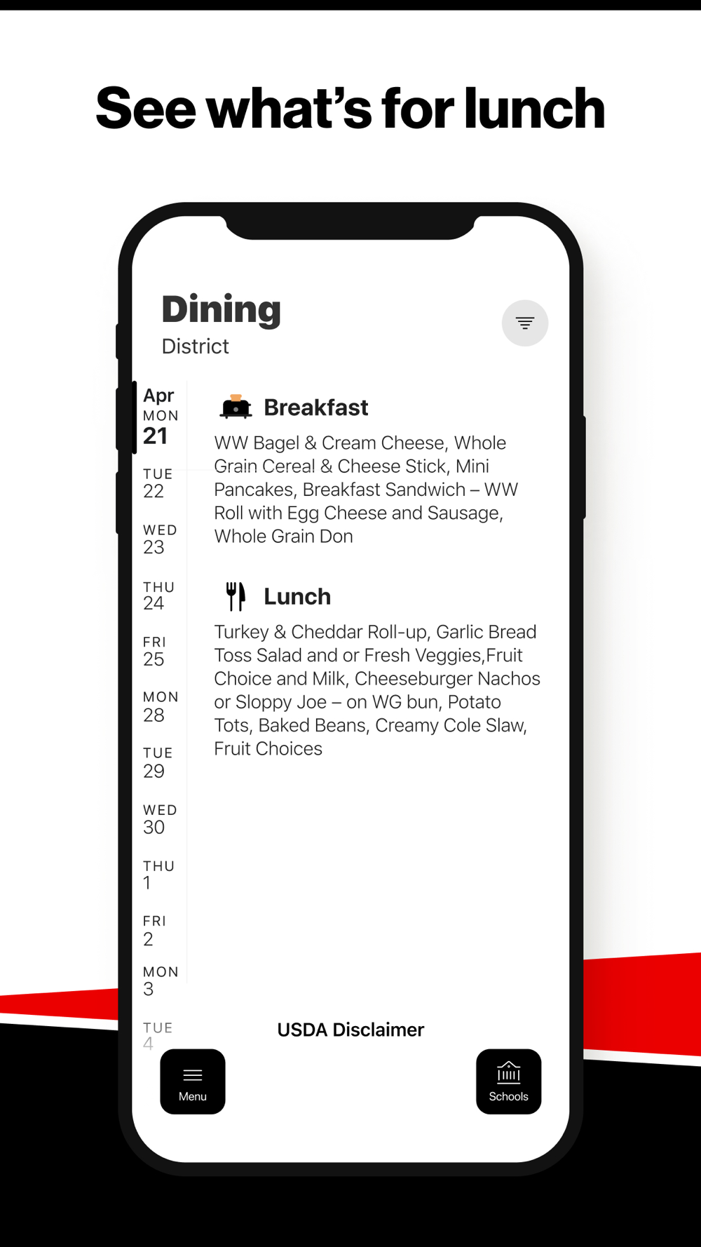 Within the dining section, you'll find an easy to navigate, weekly menu, sorted by day and meal type.