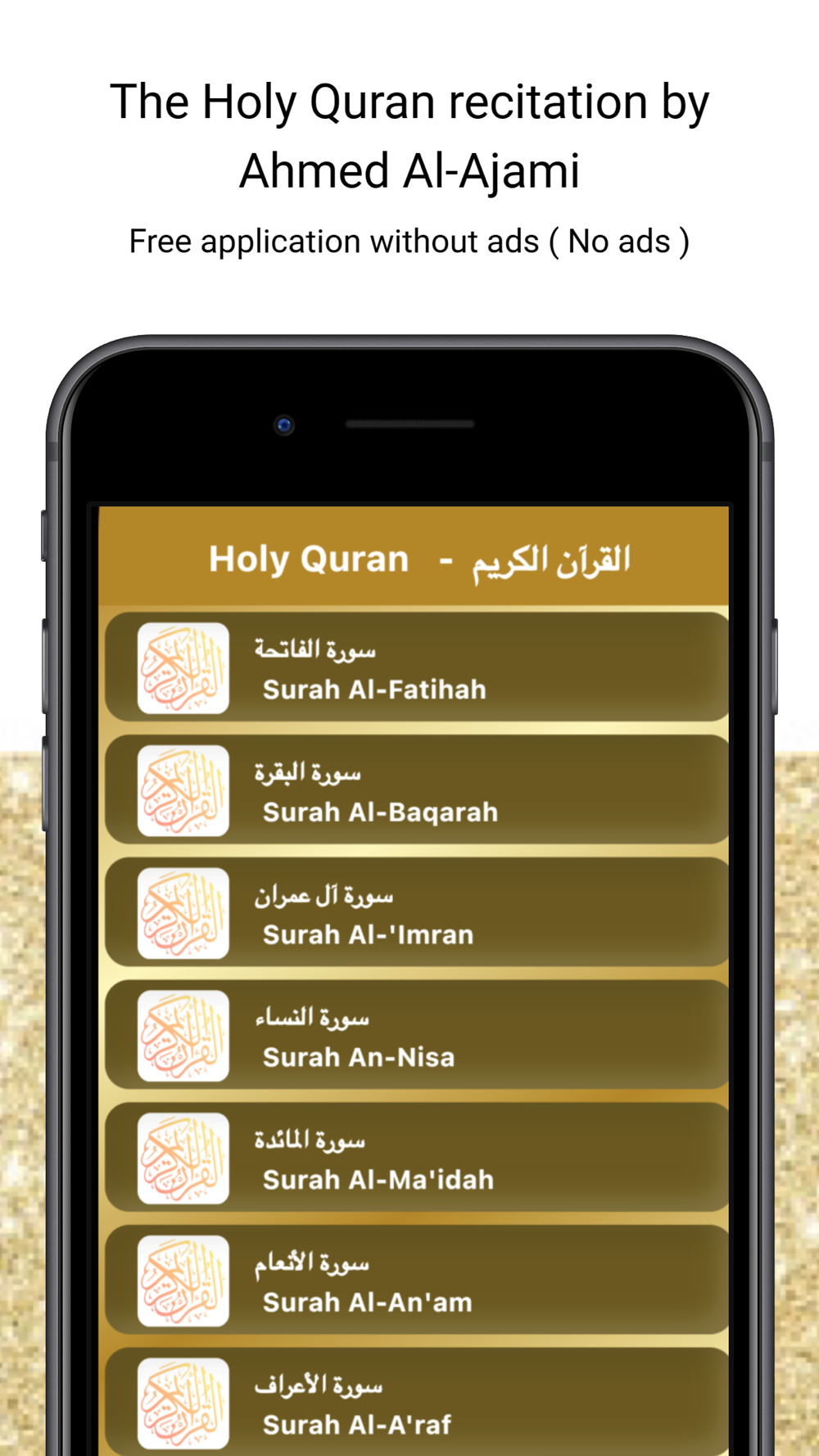 The application of the Noble Qur’an recitation by Ahmed Al-Ajami, allow you to listen to all chapters of the Holy Qur’an without Internet from your cell phone or your mobile