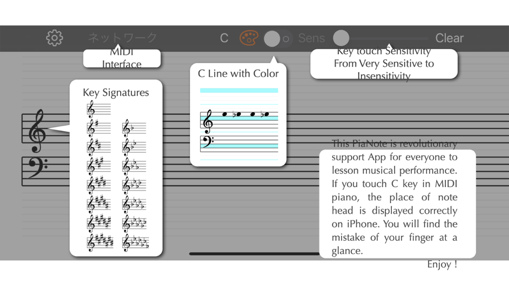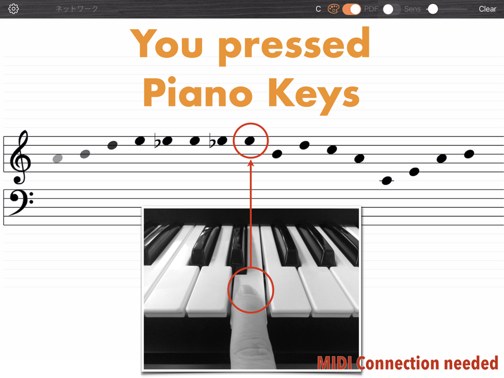 If you touch C key in piano, the place of note head is displayed correctly on iPad(iPhone). You will find the mistake of your finger at a glance.