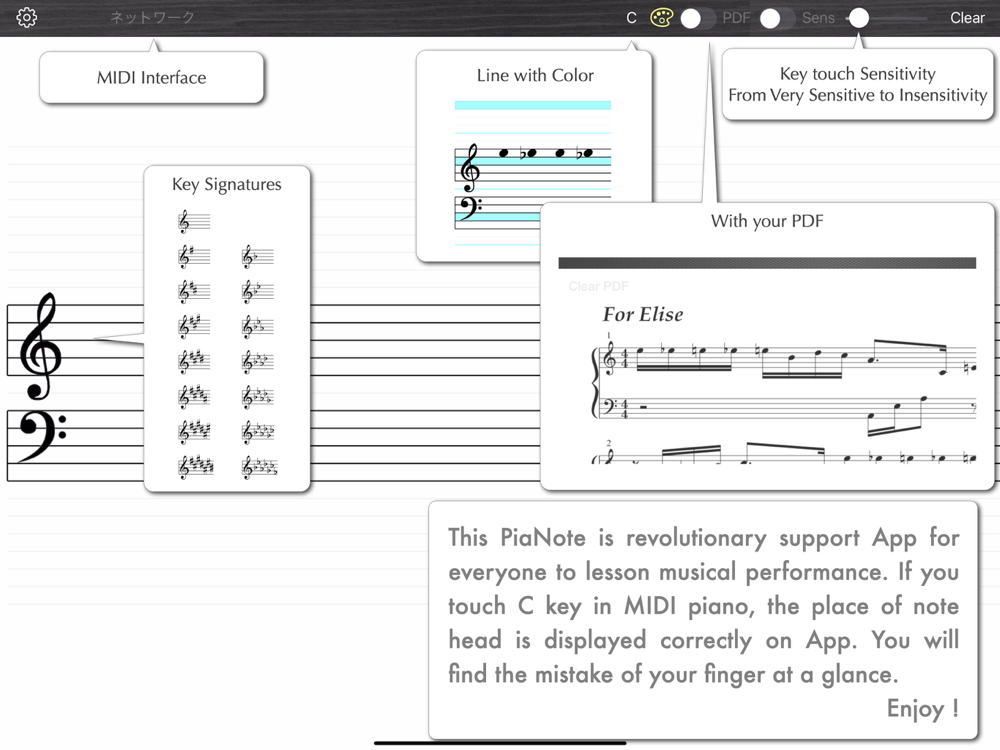This PiaNote is revolutionary support App for everyone to lesson musical performance from those difficulties.