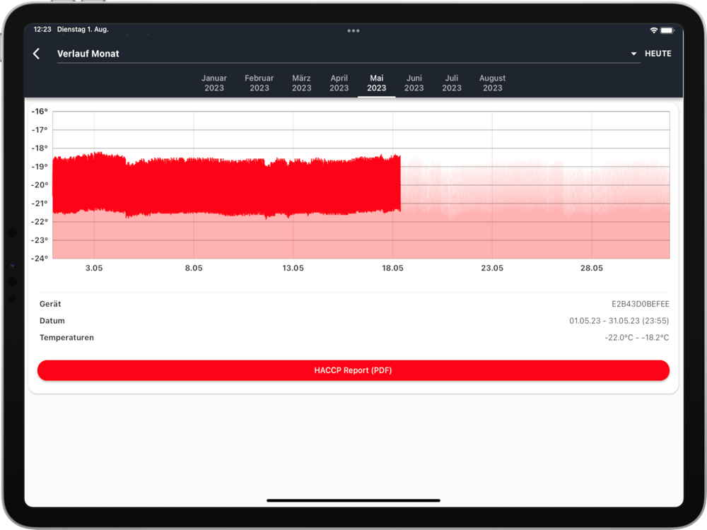 Das ggmgastro Thermometer ermöglicht die zuverlässige Dokumentation und Überwachung deiner Kühleinheiten. Es ist HACCP-konform, was bedeutet, dass es den Richtlinien für Lebensmittelsicherheit entspricht. Mit diesem Thermometer kannst du die Temperaturen in deinen Kühlgeräten präzise erfassen und sicherstellen, dass sie stets in einem sicheren Bereich liegen, um die Frische und Qualität der Lebensmittel zu gewährleisten. Die umfassende Dokumentation hilft dabei, die Einhaltung der Hygienevorschriften nachzuweisen und ermöglicht eine lückenlose Rückverfolgbarkeit von Temperaturdaten. So kannst du jederzeit den Überblick über die Kühlbedingungen behalten und gegebenenfalls rechtzeitig reagieren, um mögliche Gefahren zu minimieren.