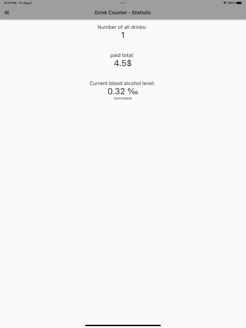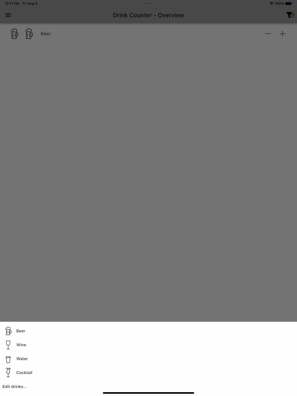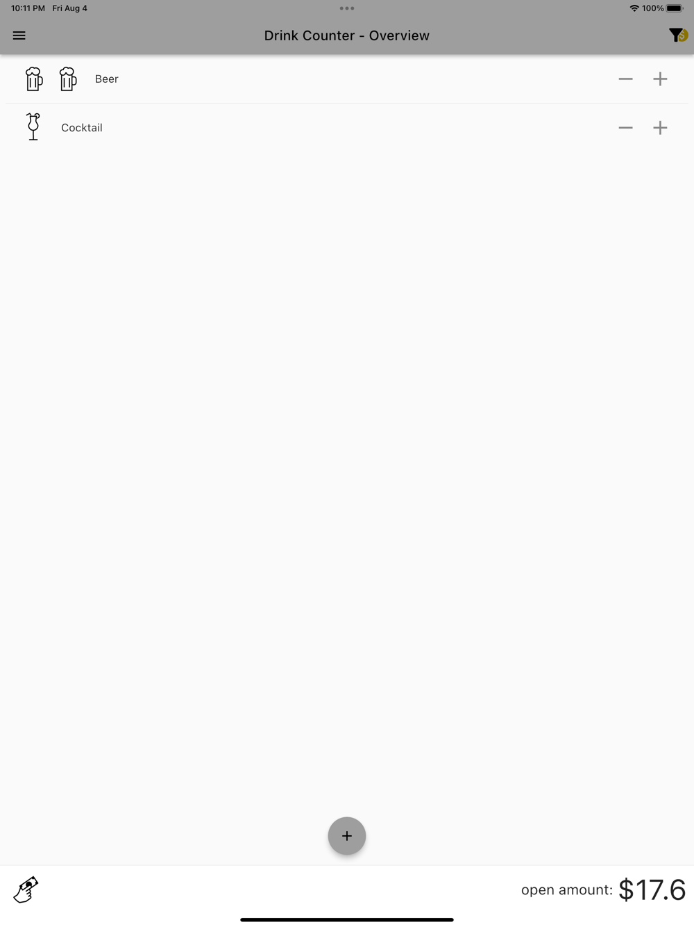 - Cost Tracker: Worried about your bar tab? Drink Counter has you covered. The app calculates the cost of your drinks based on manual input. Stay informed about your expenses throughout the night and make sure you're on budget. Additionally, this could help you to check if the number of drinks from your bar/restaurant bill is correct.