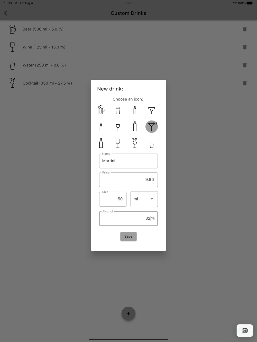 - It offers an easy way to add custom drinks (with prices, size and percentage of alcohol).
