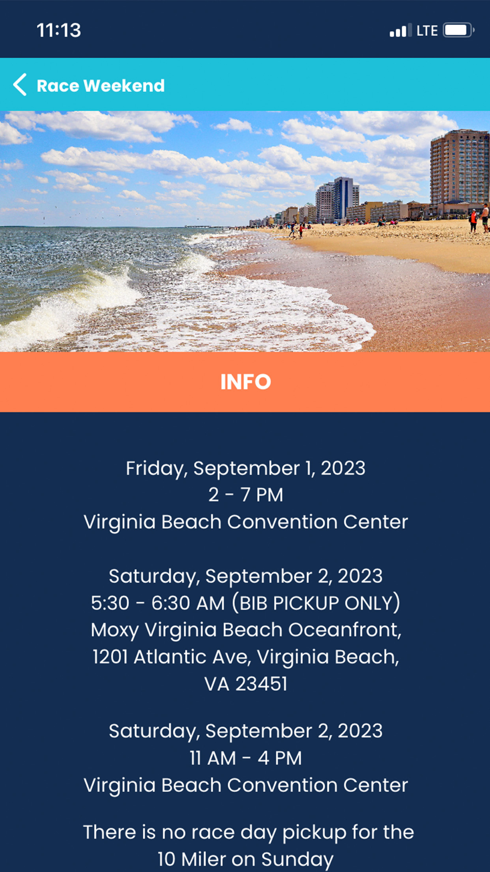 The Virginia Beach 10 miler app offers all the essential information for your race weekend. Features include live tracking, results, camera integration with fun photobooth-like features, event schedule, participant information, and race weekend experiences. Make the most of your race in Virginia Beach, Virginia.