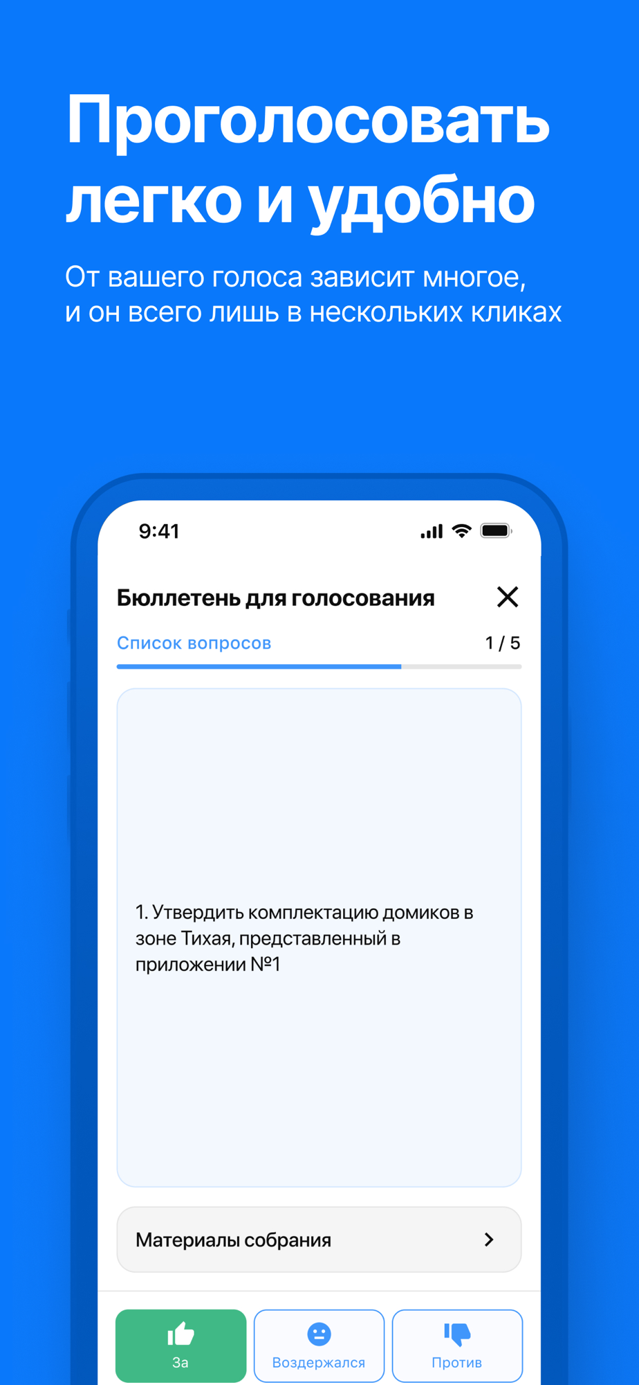Централизованное принятие решений по объектам стало проще благодаря инструменту голосований. Вы и другие инвесторы можете выражать свои мнения и предпочтения через приложение, с отображением процента участия каждого.
