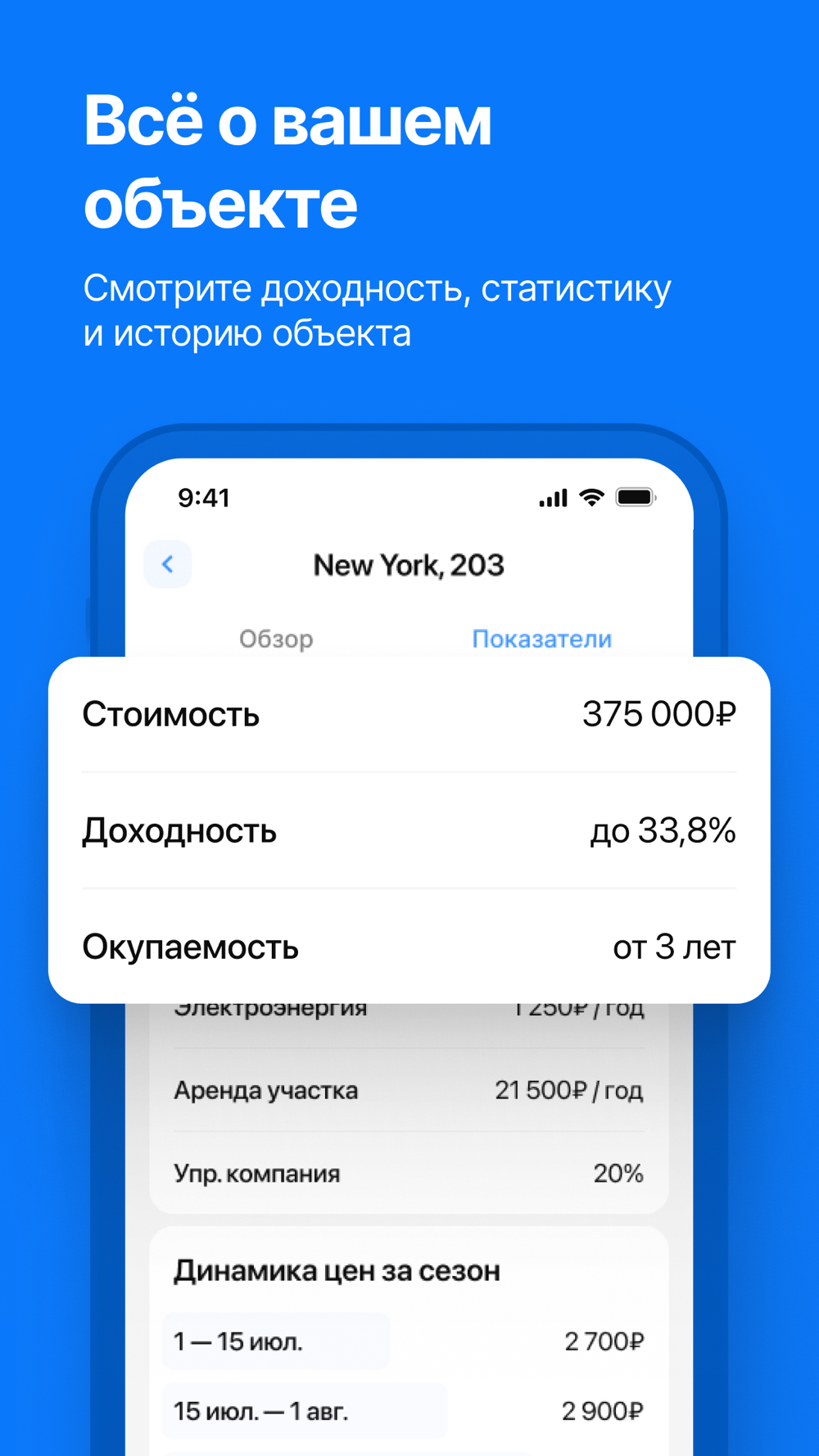 В этом разделе вы найдете полный список ваших туристических объектов. Каждый объект сопровождается подробной информацией о доходности, загрузке, стоимости и других важных показателях. Управление вашим портфелем становится удобным и прозрачным.