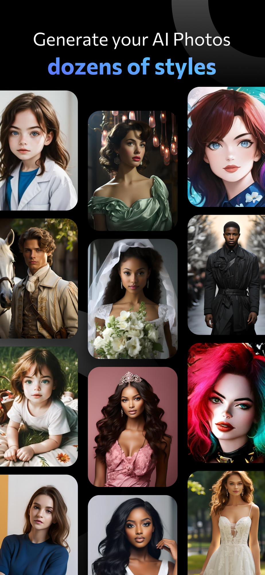 2. AI Profile function: You only need to import a photo and it only takes 30 seconds to generate AI Profiles of different styles. Dozens of styles are supported currently, including professional headshot, wedding dress photos, pregnancy photos, etc.