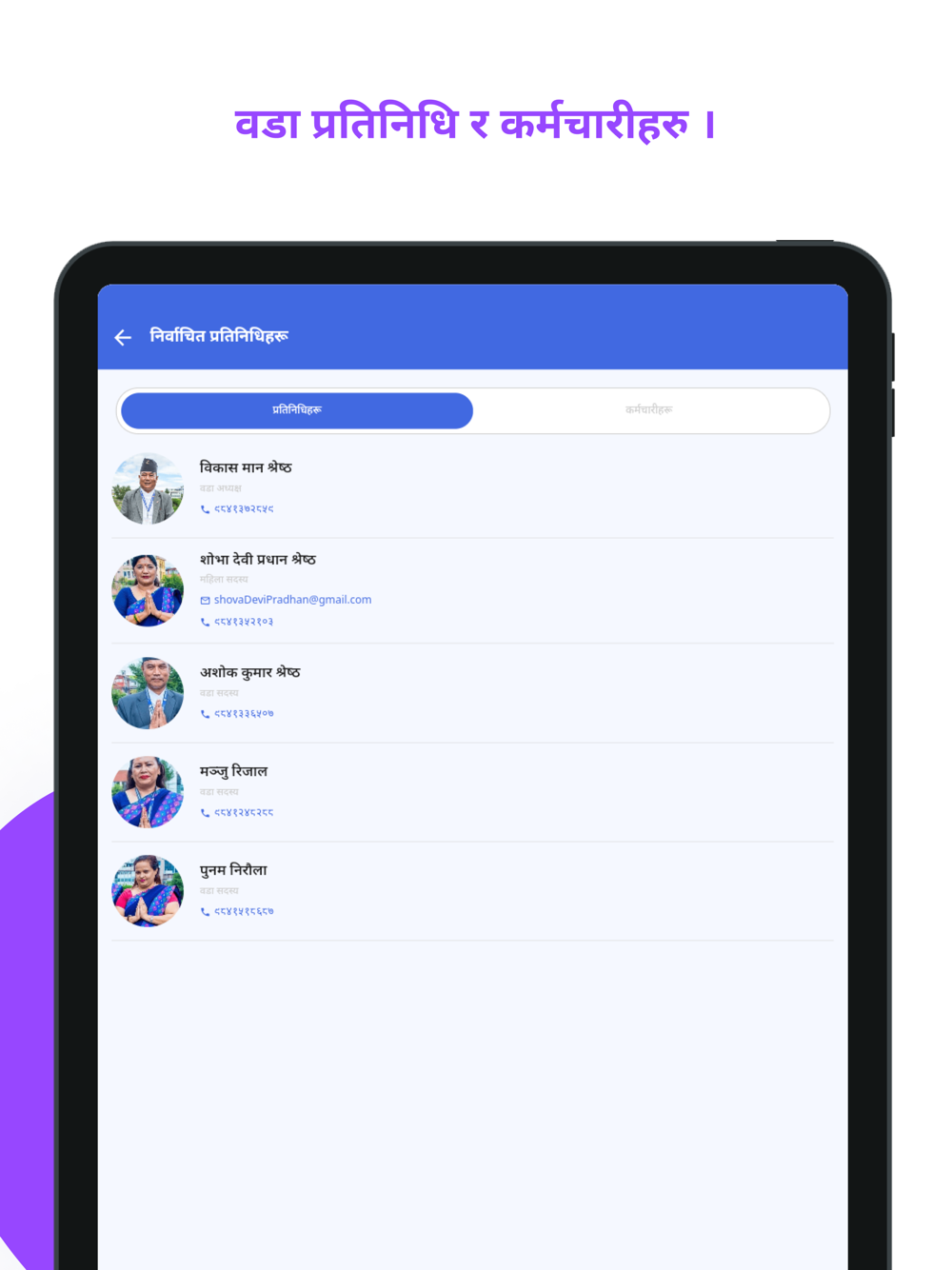 In this application, user will be able to view the ward information, details about the ward members and elected representatives, view citizen charter and dynamically generate the application form through the mobile application, view upcoming events in the ward, view news and notices that are published by the ward, view legal and other publications, get ward updates, view the emergency contacts in Ward 5, view upcoming ward plans, tourism attractions in a ward, business directories, and many more.