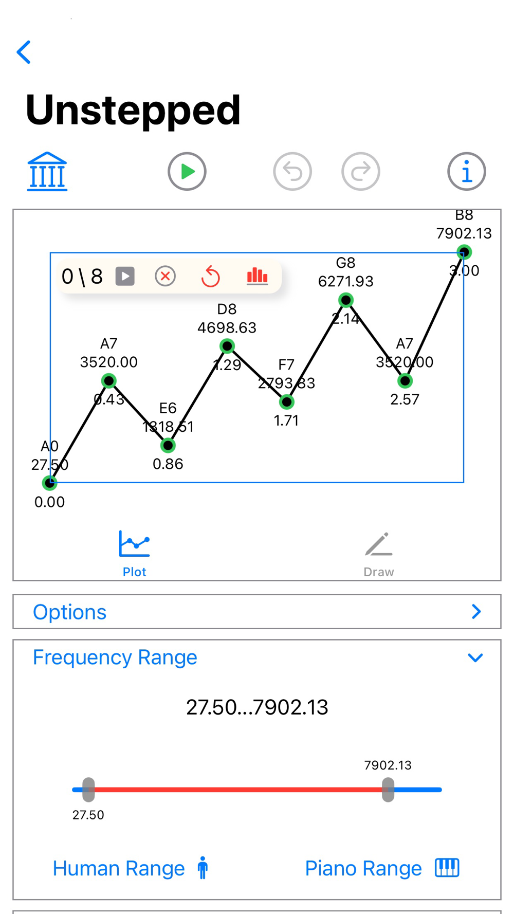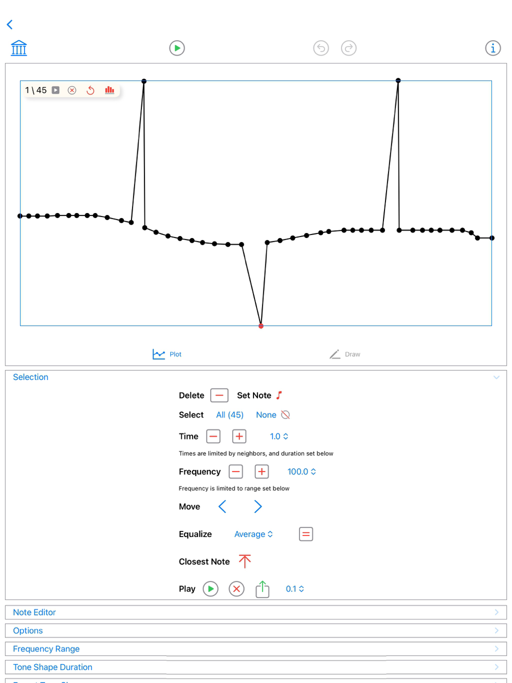 Tap in the plot view to add points with coordinates (frequency, time). Drag to move points, but limited by the neighbors time.